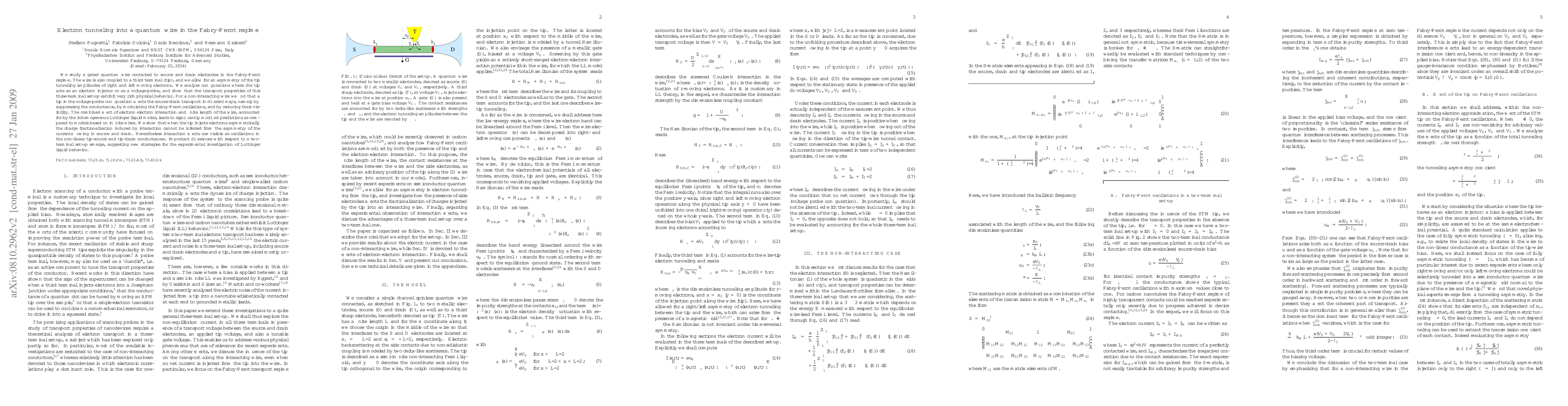 This paper investigates electron tunneling in a gated quantum wire in the Fabry-Perot regime, focusing on a three-terminal setup where a tip acts as an electron injector or voltage-probe. It reveals complex transport behaviors, including conductance suppression and modulation of Fabry-Perot oscillations, with significant differences arising from electron interactions and finite wire length.
