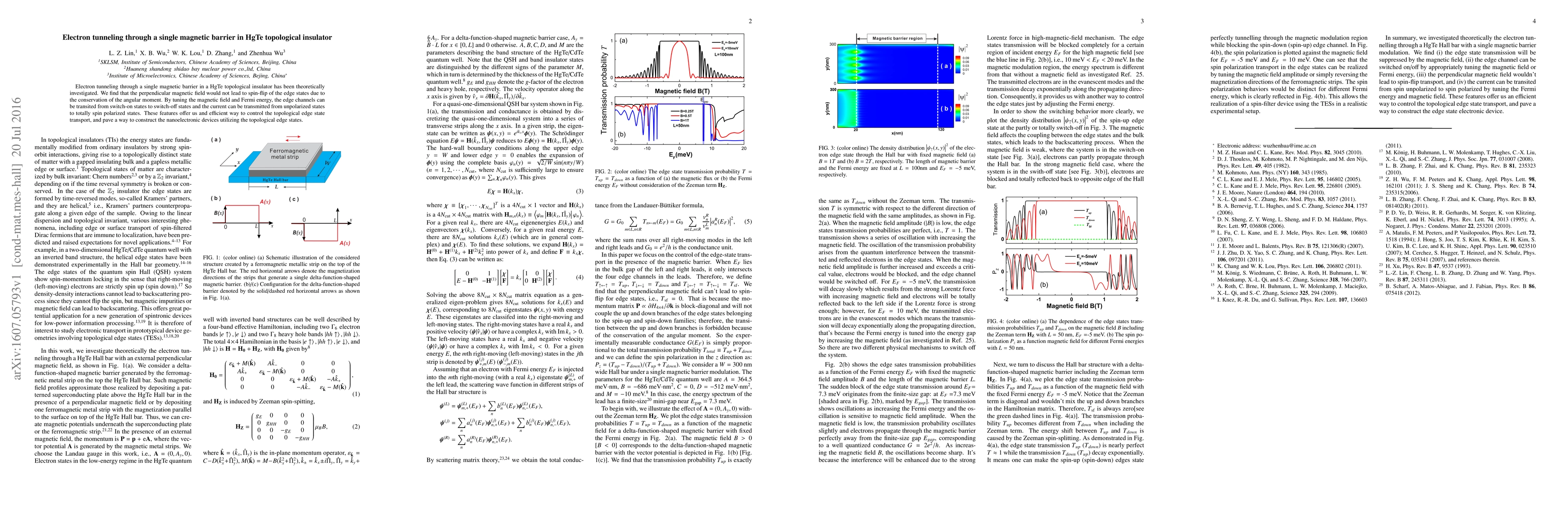 This paper investigates electron tunneling through a magnetic barrier in HgTe topological insulator, finding that angular momentum conservation prevents spin-flip of edge states. By adjusting magnetic field and Fermi energy, the edge channels can switch between on and off states, enabling control over current transmission from unpolarized to fully spin-polarized states, which could facilitate the development of nanoelectronic devices.