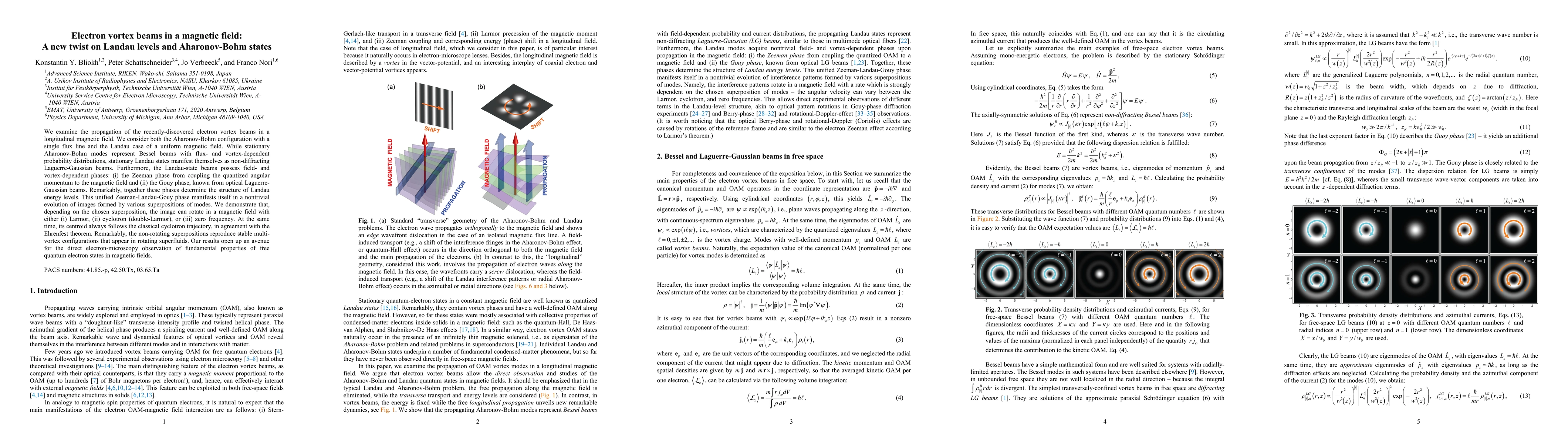 We examine the propagation of the recently-discovered electron vortex beams in a longitudinal magnetic field. We consider both the Aharonov-Bohm configuration with a single flux line and the Landau case of a uniform magnetic field. While stationary Aharonov-Bohm modes represent Bessel beams with flux- and vortex-dependent probability distributions, stationary Landau states manifest themselves as non-diffracting Laguerre-Gaussian beams. Furthermore, the Landau-state beams possess field- and vortex-dependent phases: (i) the Zeeman phase from coupling the quantized angular momentum to the magnetic field and (ii) the Gouy phase, known from optical Laguerre-Gaussian beams. Remarkably, together these phases determine the structure of Landau energy levels. This unified Zeeman-Landau-Gouy phase manifests itself in a nontrivial evolution of images formed by various superpositions of modes. We demonstrate that, depending on the chosen superposition, the image can rotate in a magnetic field with either (i) Larmor, (ii) cyclotron (double-Larmor), or (iii) zero frequency. At the same time, its centroid always follows the classical cyclotron trajectory, in agreement with the Ehrenfest theorem. Remarkably, the non-rotating superpositions reproduce stable multi-vortex configurations that appear in rotating superfluids. Our results open up an avenue for the direct electron-microscopy observation of fundamental properties of free quantum electron states in magnetic fields.