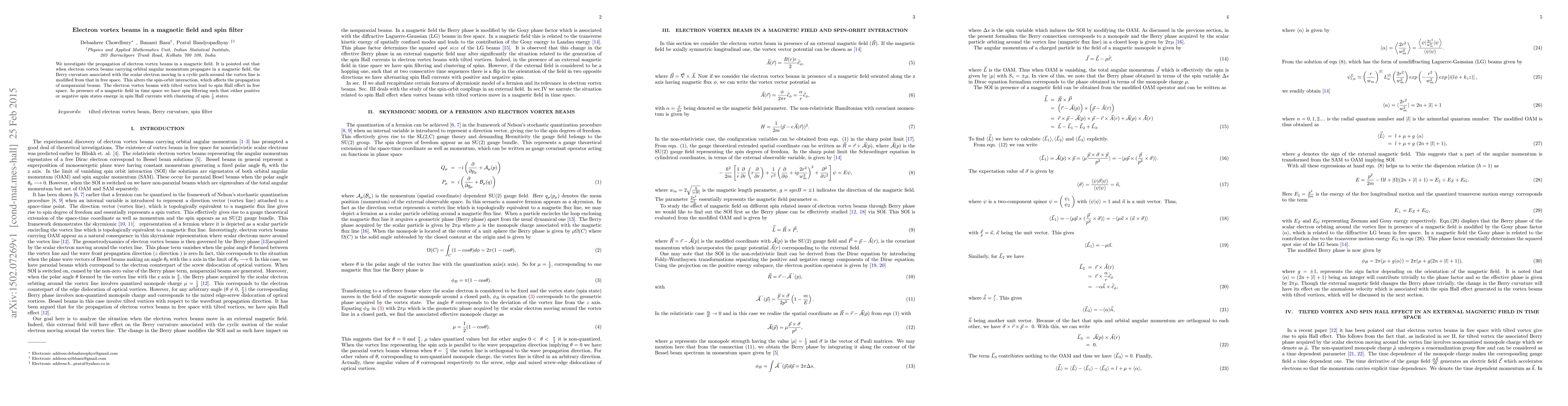 We investigate the propagation of electron vortex beams in a magnetic field. It is pointed out that when electron vortex beams carrying orbital angular momentum propagate in a magnetic field, the Berry curvature associated with the scalar electron moving in a cyclic path around the vortex line is modified from that in free space. This alters the spin-orbit interaction, which affects the propagation of nonparaxial beams. The electron vortex beams with tilted vortex lead to spin Hall effect in free space. In presence of a magnetic field in time space we have spin filtering such that either positive or negative spin states emerge in spin Hall currents with clustering of spin $\frac{1}{2}$ states.