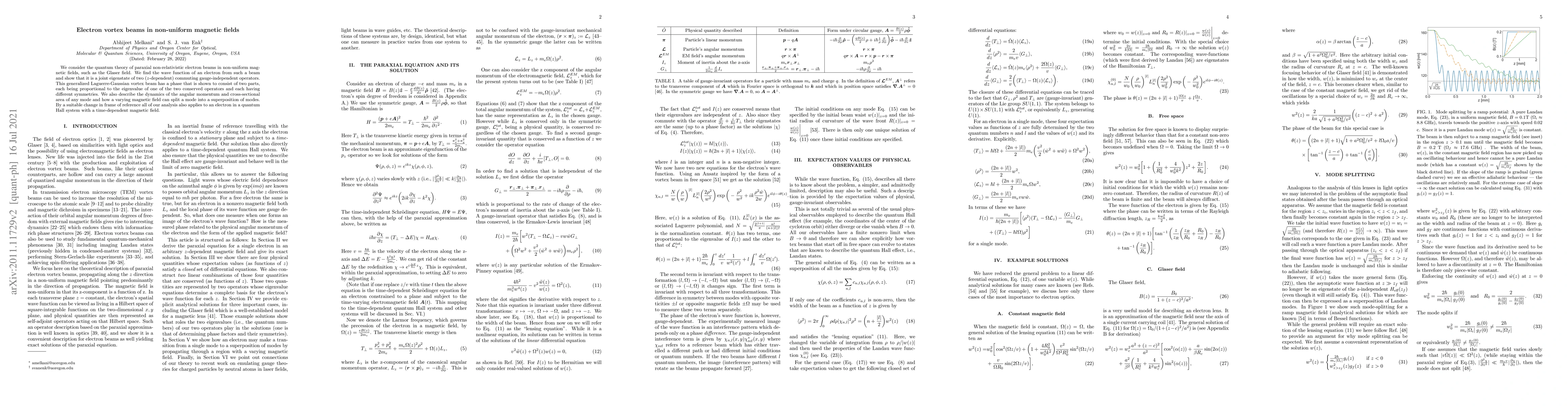 We consider the quantum theory of paraxial non-relativistic electron beams in non-uniform magnetic fields, such as the Glaser field. We find the wave function of an electron from such a beam and show that it is a joint eigenstate of two ($z$-dependent) commuting gauge-independent operators. This generalized Laguerre-Gaussian vortex beam has a phase that is shown to consist of two parts, each being proportional to the eigenvalue of one of the two conserved operators and each having different symmetries. We also describe the dynamics of the angular momentum and cross-sectional area of any mode and how a varying magnetic field can split a mode into a superposition of modes. By a suitable change in frame of reference all of our analysis also applies to an electron in a quantum Hall system with a time-dependent magnetic field.