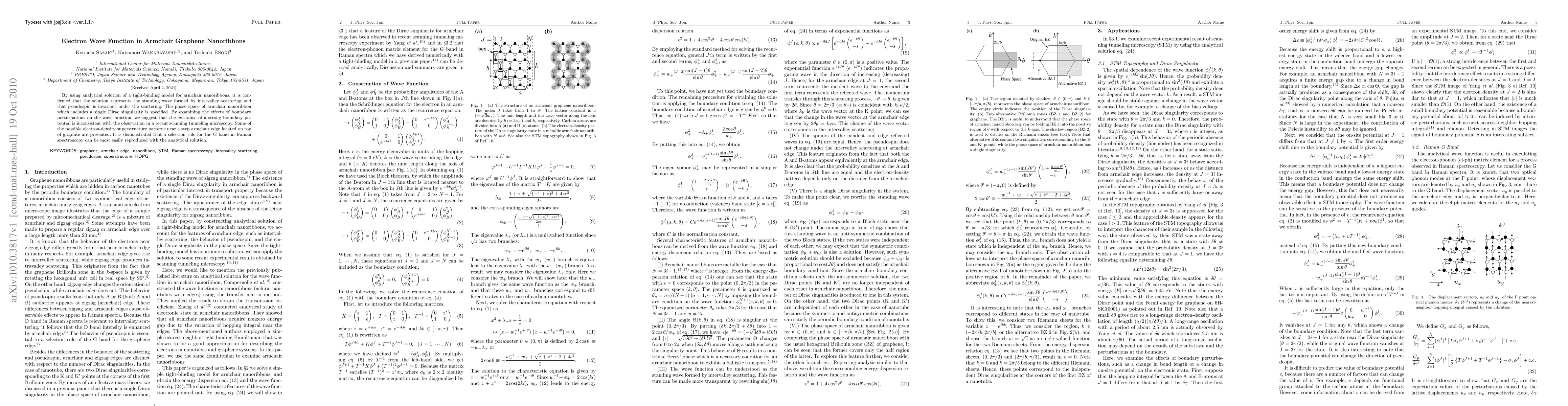 This paper analytically confirms that the electron wave function in armchair graphene nanoribbons represents standing waves via intervalley scattering, maintaining pseudospin invariance. It also identifies a phase space with a single Dirac singularity and disputes strong boundary potentials, suggesting alternative electron-density patterns and a selection rule for Raman spectroscopy.