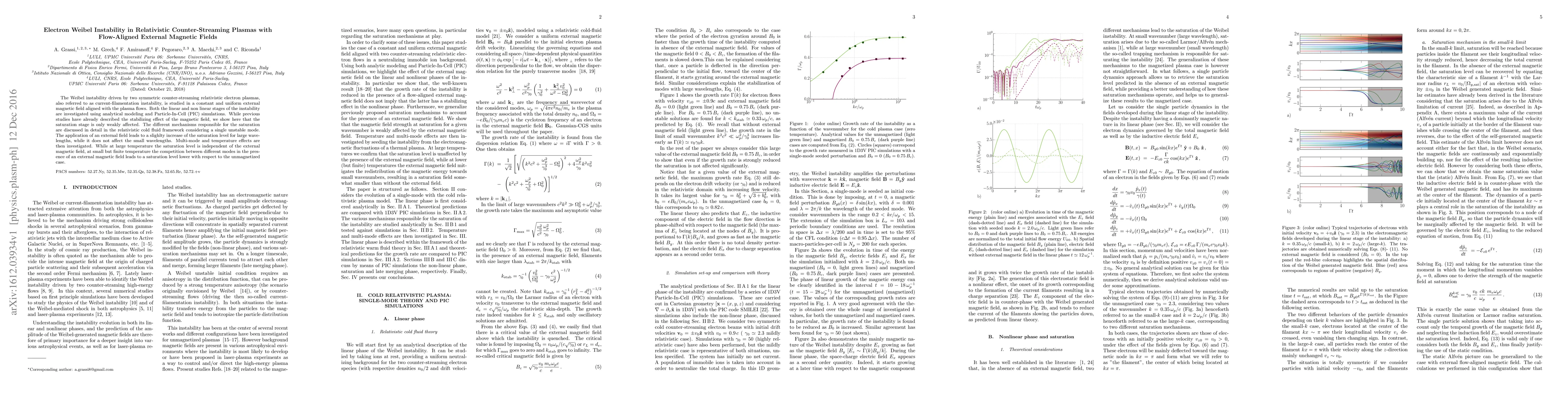 This paper investigates the Weibel instability in relativistic counter-streaming electron plasmas with an aligned external magnetic field, using both analytical modeling and PIC simulations. It finds that while the magnetic field stabilizes the instability, its effect on saturation is minimal, especially for small wavelengths, and that temperature influences the saturation level in the presence of the magnetic field.