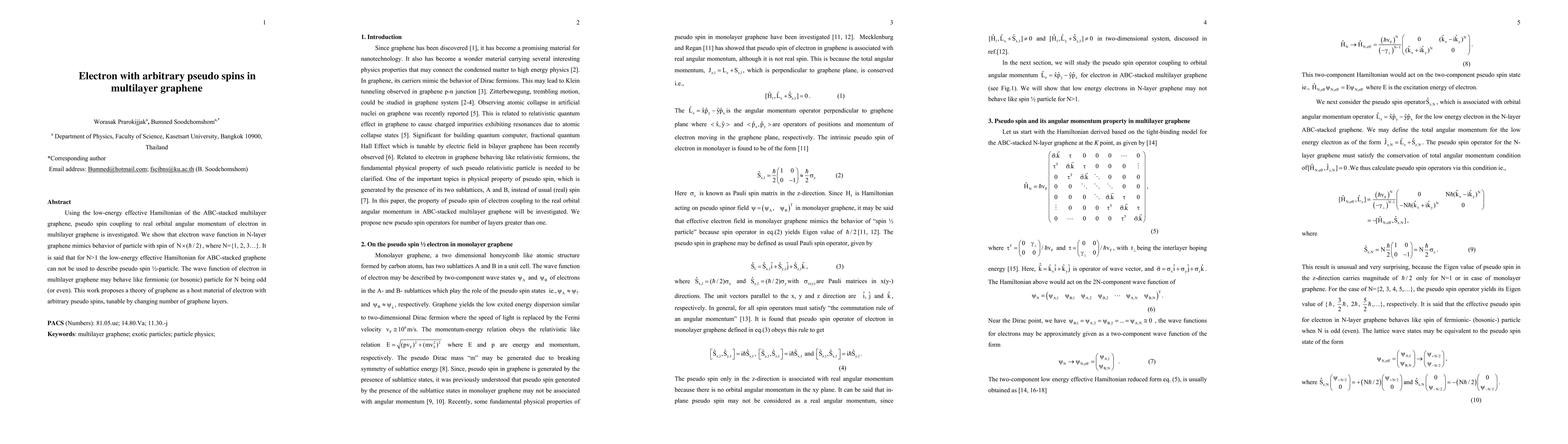 Using the low-energy effective Hamiltonian of the ABC-stacked multilayer graphene, pseudo spin coupling to real orbital angular momentum of electron in multilayer graphene is investigated. We show that electron wave function in N-layer graphene mimics behavior of particle with spin of N/2. It is said that for N greater than 1 the low-energy effective Hamiltonian for ABC-stacked graphene is no longer used to describe pseudo spin 1/2-particle wave function. The wave function of electron in multilayer graphene may behave like fermionic (or bosonic) particle when N is odd (or even). This work proposes a theory of graphene as a host material of electron with arbitrary pseudo spins, tunable by changing number of graphene layers.