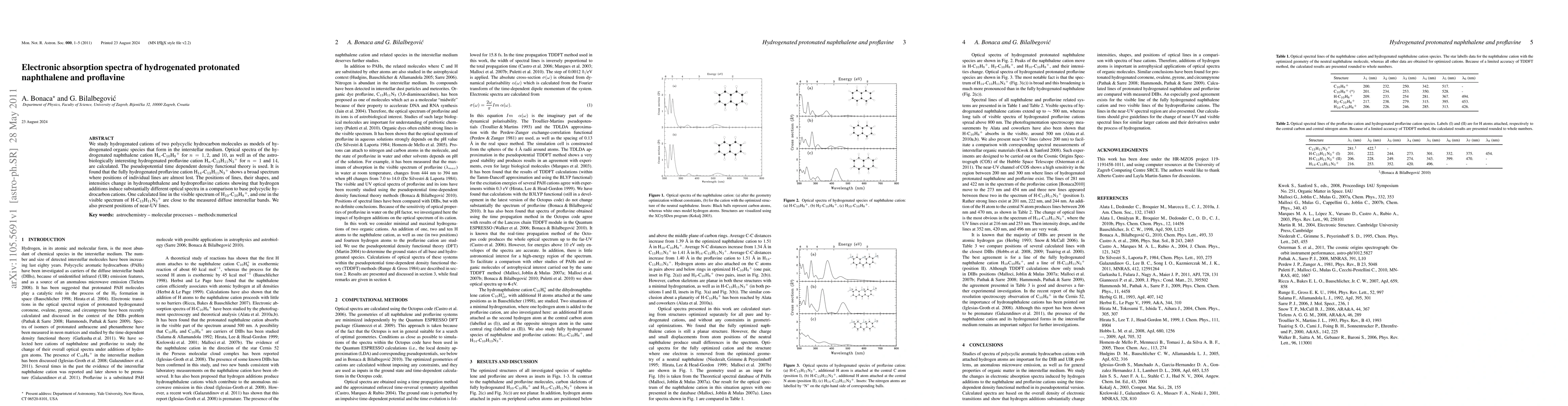Researchers calculated optical spectra of hydrogenated naphthalene and proflavine cations using density functional theory, finding that hydrogen additions induce different spectra than their base counterparts, with some lines matching measured diffuse interstellar bands.
