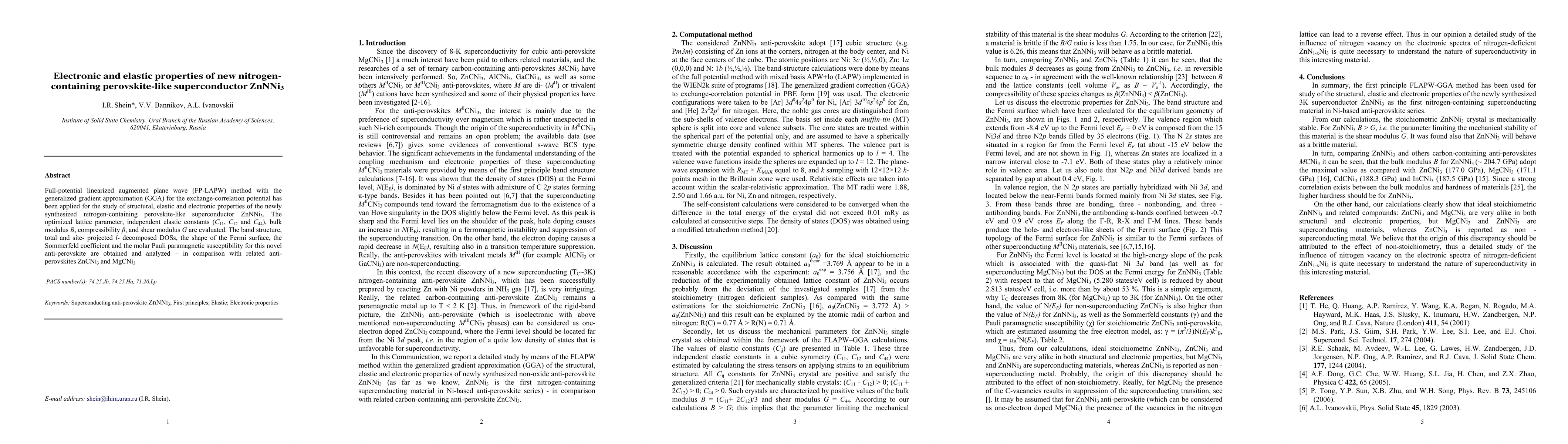 Full-potential linearized augmented plane wave (FP-LAPW) method with the generalized gradient approximation (GGA) for the exchange-correlation potential has been applied for the study of structural, elastic and electronic properties of the newly synthesized nitrogen-containing perovskite-like superconductor ZnNNi3. The optimized lattice parameter, independent elastic constants (C11, C12 and C44), bulk modulus B, compressibility betta, and shear modulus G are evaluated. The band structure, total and site- projected l- decomposed DOSs, the shape of the Fermi surface, the Sommerfeld coefficient and the molar Pauli paramagnetic susceptibility for this novel anti-perovskite are obtained and analyzed in comparison with related anti-perovskites ZnCNi3 and MgCNi3