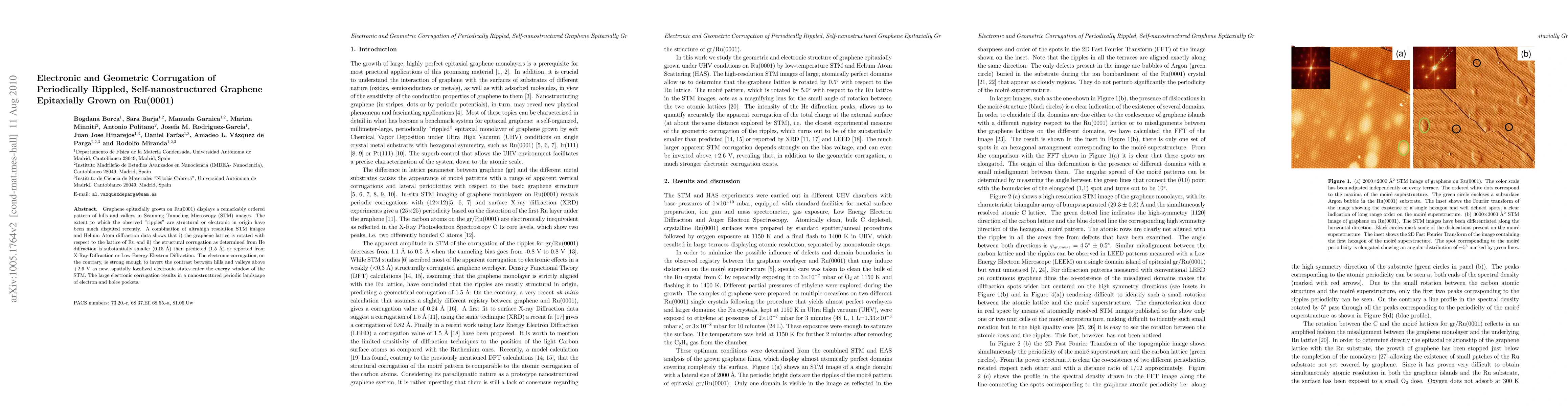 Graphene epitaxially grown on Ru(0001) displays a remarkably ordered pattern of hills and valleys in Scanning Tunneling Microscopy (STM) images. To which extent the observed "ripples" are structural or electronic in origin have been much disputed recently. A combination of ultrahigh resolution STM images and Helium Atom diffraction data shows that i) the graphene lattice is rotated with respect to the lattice of Ru and ii) the structural corrugation as determined from He diffraction is substantially smaller (0.015 nm) than predicted (0.15 nm) or reported from X-Ray Diffraction or Low Energy Electron Diffraction. The electronic corrugation, on the contrary, is strong enough to invert the contrast between hills and valleys above +2.6 V as new, spatially localized electronic states enter the energy window of the STM. The large electronic corrugation results in a nanostructured periodic landscape of electron and holes pockets.