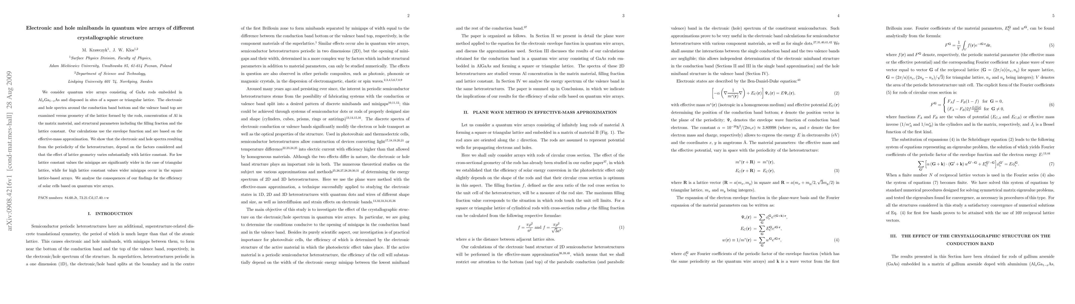 This study investigates the electronic and hole minibands in quantum wire arrays of varying crystallographic structures, finding that their spectra significantly depend on the lattice geometry and structural parameters. The research highlights that minigaps differ substantially between square and triangular lattices, with implications for the efficiency of solar cells utilizing these quantum wire arrays.