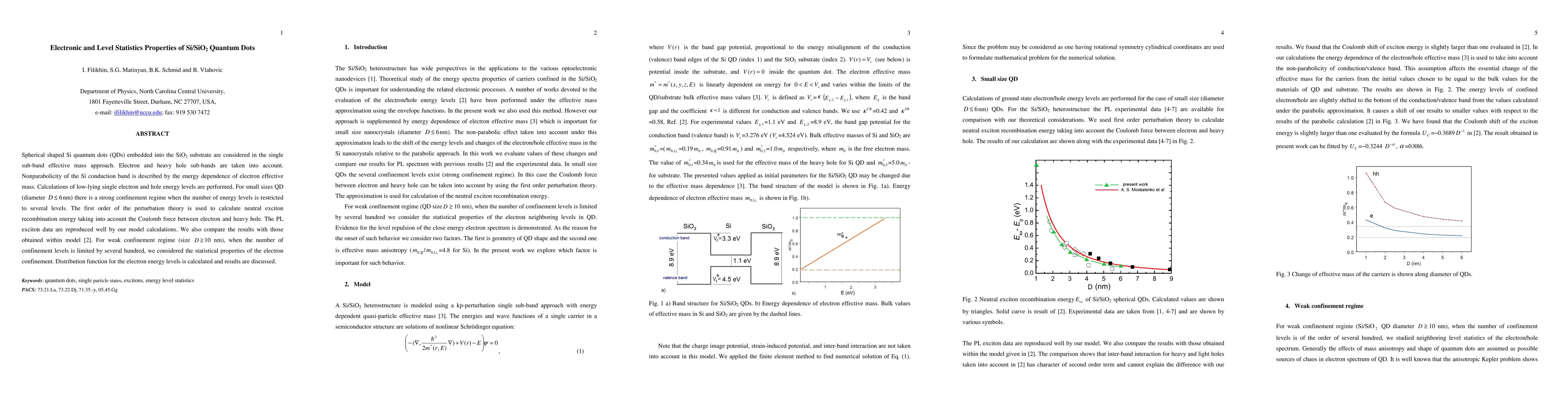 Spherical shaped Si quantum dots (QDs) embedded into the SiO2 substrate are considered in the single sub-band effective mass approach. Nonparabolicity of the Si conduction band is described by the energy dependence of electron effective mass. Calculations of low-lying single electron and hole energy levels are performed. For small sizes QD (diameter D<6nm) there is a strong confinement regime when the number of energy levels is restricted to several levels. The first order of the perturbation theory is used to calculate neutral exciton recombination energy taking into account the Coulomb force between electron and heavy hole. The PL exciton data are reproduced well by our model calculations. For weak confinement regime (size D>10 nm), when the number of confinement levels is limited by several hundred, we considered the statistical properties of the electron confinement. Distribution function for the electron energy levels is calculated and results are discussed.