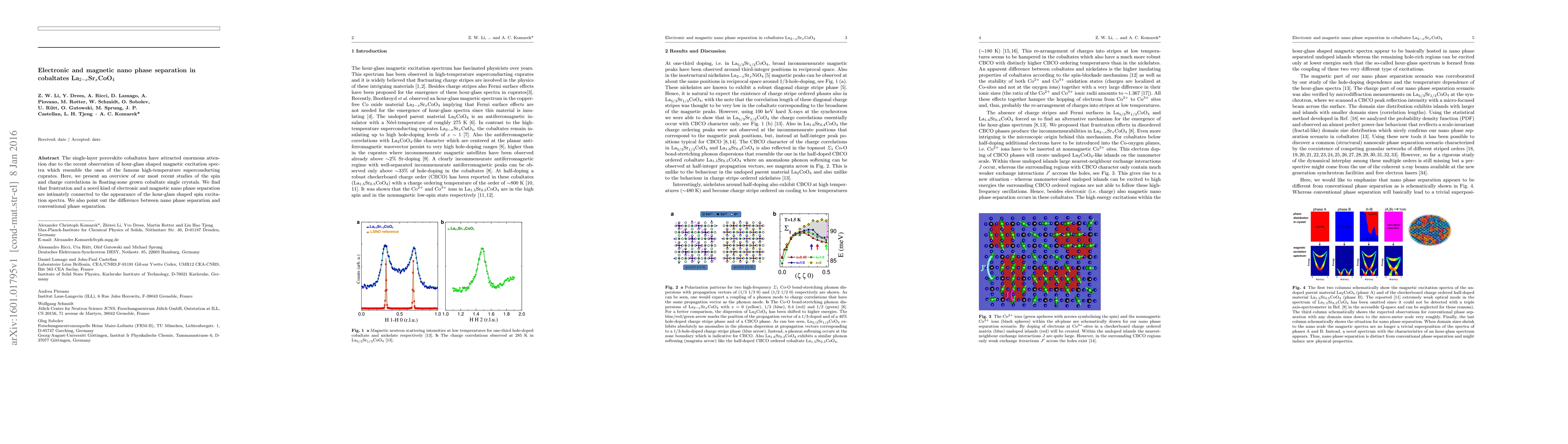 This paper investigates single-layer perovskite cobaltates, highlighting the connection between frustration, electronic and magnetic nano phase separation, and the unique hour-glass shaped magnetic excitation spectra. The study differentiates nano phase separation from conventional phase separation, providing insights into the material's spin and charge correlations.