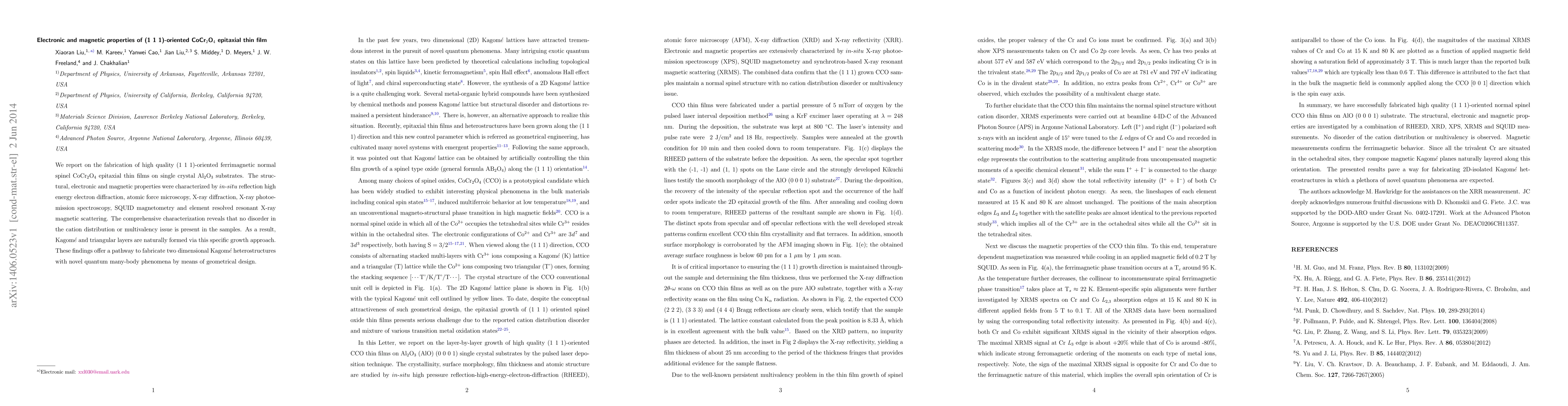 This paper details the fabrication and characterization of high-quality (1 1 1)-oriented CoCr2O4 epitaxial thin films on Al2O3 substrates, showing no cation disorder and revealing the formation of Kagome and triangular layers, which could enable the creation of novel two-dimensional Kagome heterostructures.