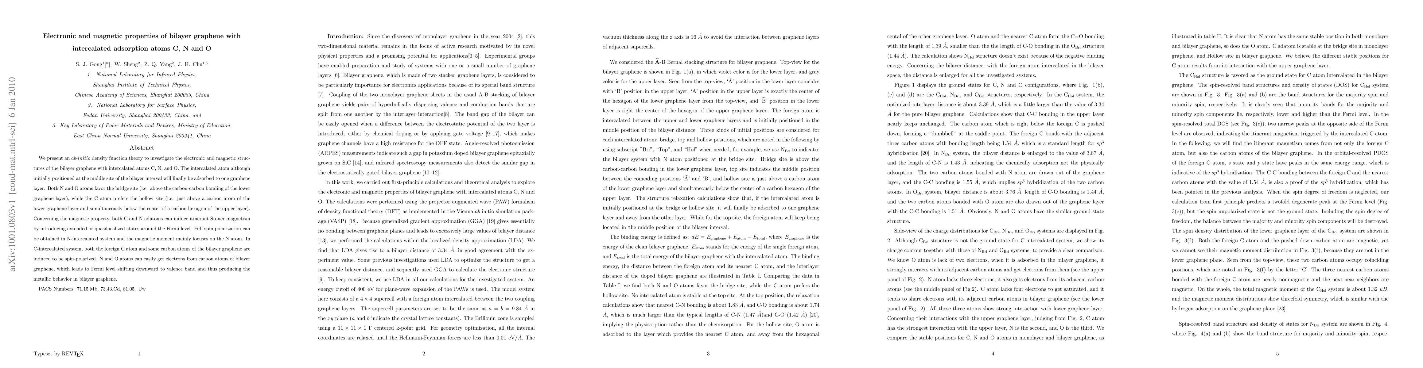 This study uses ab-initio density functional theory to explore the electronic and magnetic properties of bilayer graphene with intercalated C, N, and O atoms. The N and O atoms favor bridge sites, while the C atom prefers the hollow site. Both C and N atoms induce itinerant Stoner magnetism, with N fully spin-polarizing the system and C partially polarizing the graphene layers.