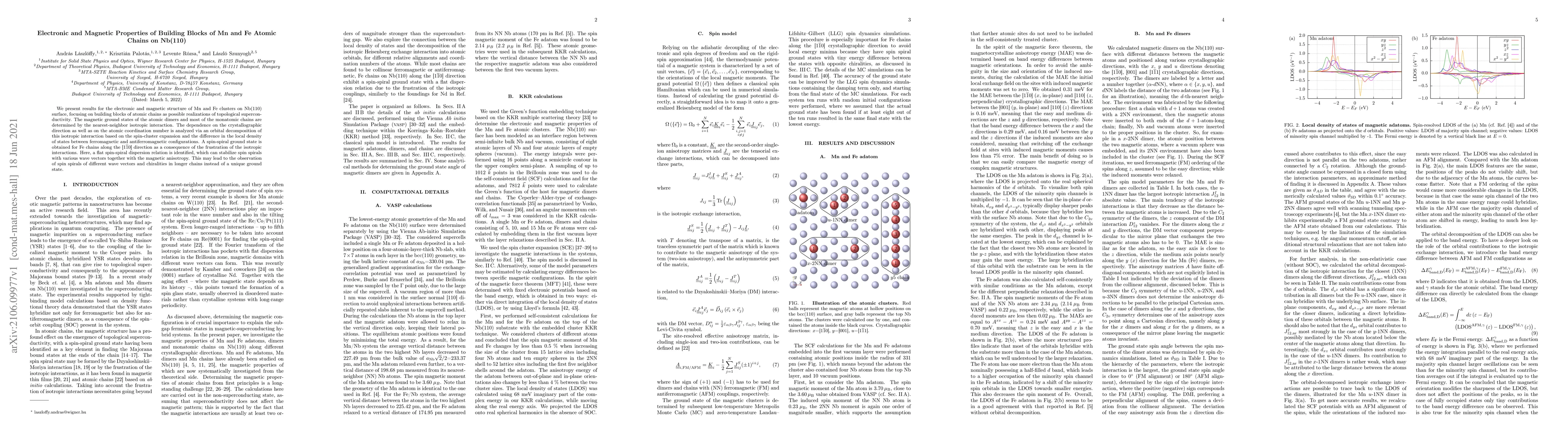 This study investigates the electronic and magnetic properties of Mn and Fe atomic chains on Nb(110) surface, revealing the magnetic ground states influenced by nearest-neighbor isotropic interactions. Fe chains exhibit spin-spiral ground states due to interaction frustration, potentially leading to diverse spin spirals in longer chains.