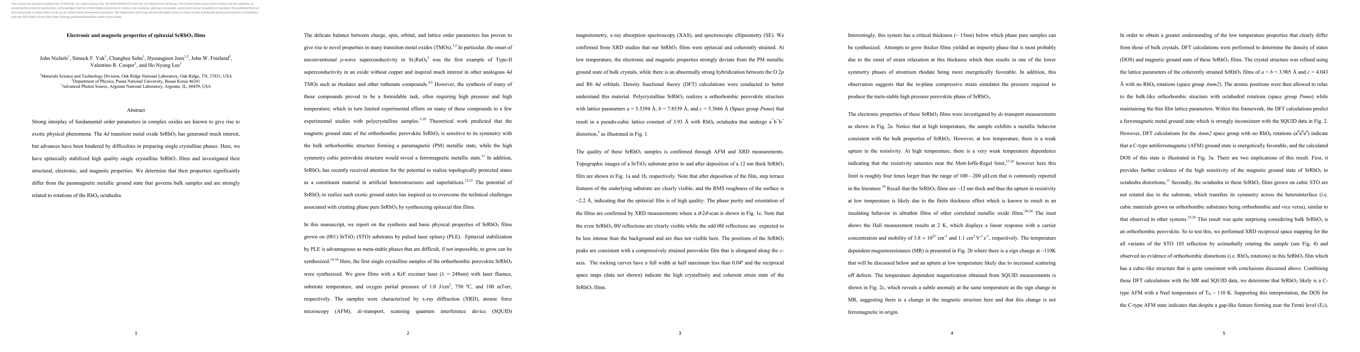 Strong interplay of fundamental order parameters in complex oxides are known to give rise to exotic physical phenomena. The 4d transition metal oxide SrRhO3 has generated much interest, but advances have been hindered by difficulties in preparing single crystalline phases. Here, we have epitaxially stabilized high quality single crystalline SrRhO3 films and investigated their structural, electronic, and magnetic properties. We determine that their properties significantly differ from the paramagnetic metallic ground state that governs bulk samples and are strongly related to rotations of the RhO6 octahedra.