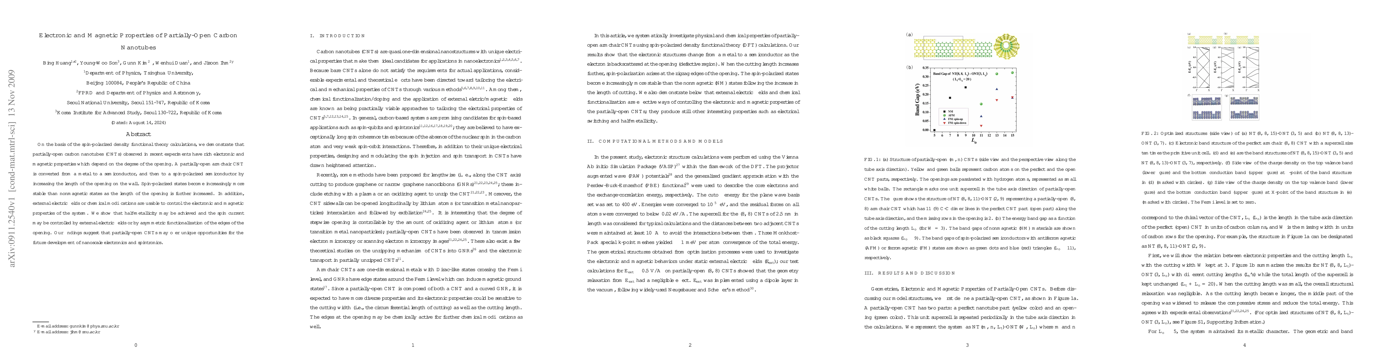 This study uses spin-polarized density functional theory to investigate how partially-open carbon nanotubes transition from metallic to semiconducting states and exhibit increasing spin-polarized properties with greater opening lengths. External electric fields or chemical edge modifications can control these electronic and magnetic properties, potentially enabling half-metallicity and spin current control, with implications for nanoscale electronics and spintronics.