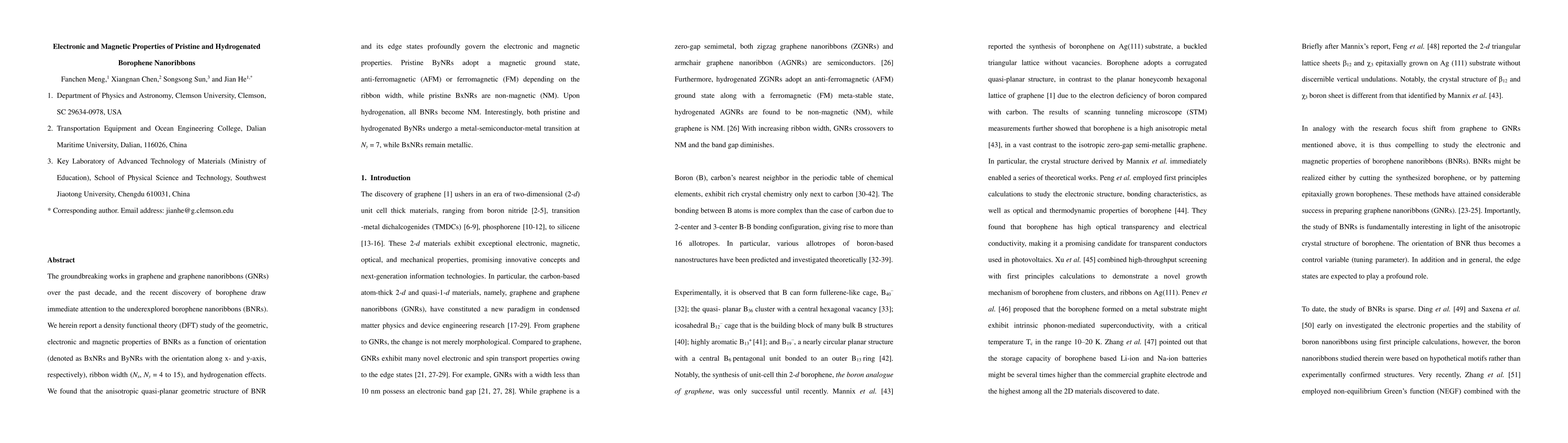 This paper investigates the electronic and magnetic properties of borophene nanoribbons (BNRs) using density functional theory. It finds that the geometric structure and edge states significantly influence these properties, with ByNRs showing magnetic behavior and BxNRs being non-magnetic. Hydrogenation renders all BNRs non-magnetic and causes a metal-semiconductor-metal transition in ByNRs at a width of Ny = 7.