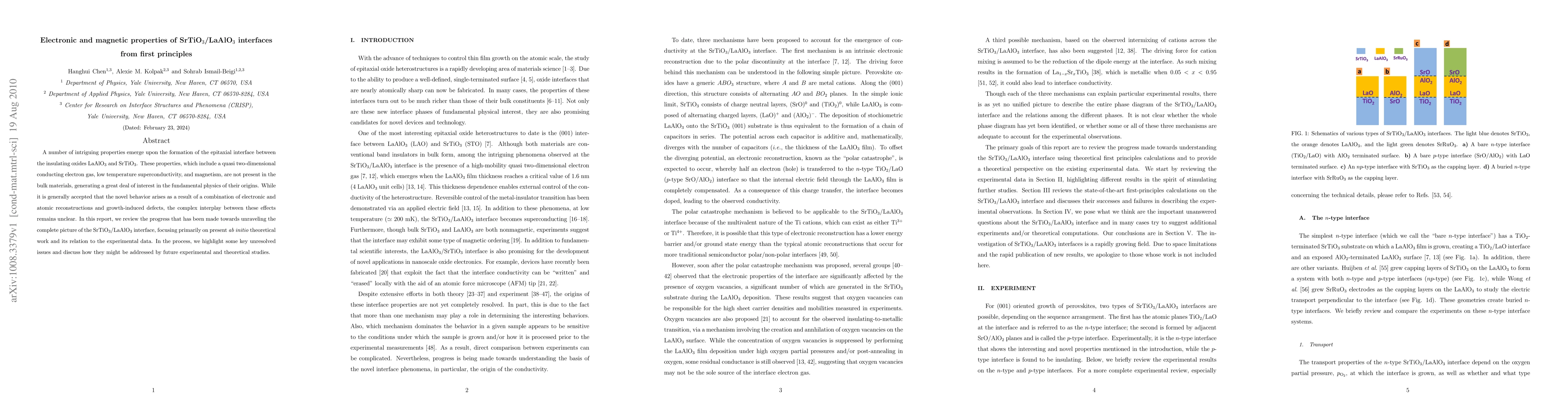 This paper reviews ab initio theoretical studies on the electronic and magnetic properties of the SrTiO3/LaAlO3 interface, revealing phenomena like conducting electron gas and superconductivity not present in bulk materials. It highlights unresolved issues in understanding the complex interplay of electronic and atomic reconstructions and growth-induced defects, suggesting future directions for both experimental and theoretical research.