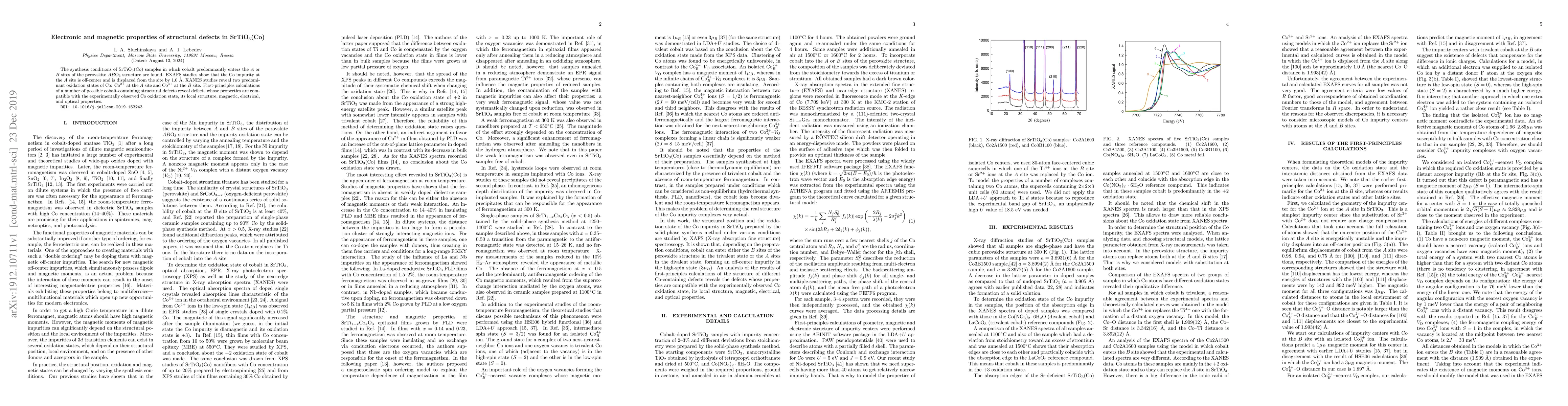 This paper investigates the electronic and magnetic properties of cobalt-doped SrTiO$_3$ under various synthesis conditions, revealing Co$^{2+}$ at the $A$ site and Co$^{3+}$ at the $B$ site through EXAFS and XANES studies. First-principles calculations confirm the compatibility of these defects with observed properties.