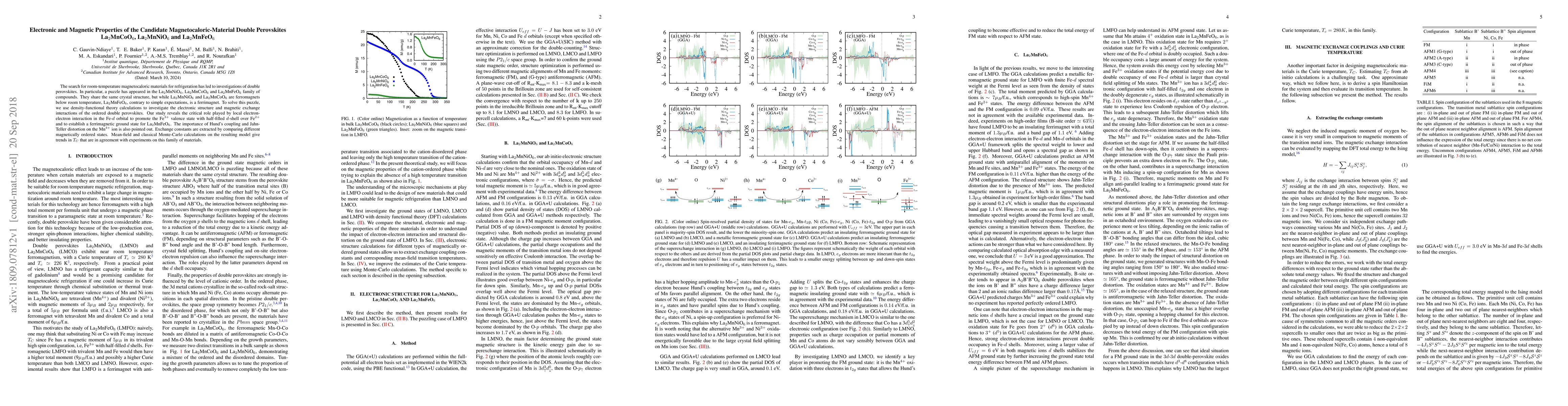 The search for room-temperature magnetocaloric materials for refrigeration has led to investigations of double perovskites. In particular, a puzzle has appeared in the La$_2$MnNiO$_6$, La$_2$MnCoO$_6$ and La$_2$MnFeO$_6$ family of compounds. They share the same crystal structure, but while La$_2$MnNiO$_6$ and La$_2$MnCoO$_6$ are ferromagnets below room temperature, La$_2$MnFeO$_6$, contrary to simple expectations, is a ferrimagnet. To solve this puzzle, we use density-functional theory calculations to investigate the electronic structure and magnetic exchange interactions of the ordered double perovskites. Our study reveals the critical role played by local electron-electron interaction in the Fe-$d$ orbital to promote the Fe$^{3+}$ valence state with half-filled $d$-shell over Fe$^{2+}$ and to establish a ferrimagnetic ground state for La$_2$MnFeO$_6$. The importance of Hund's coupling and Jahn-Teller distortion on the Mn$^{4+}$ ion is also pointed out. Exchange constants are extracted by comparing different magnetically ordered states. Mean-field and classical Monte-Carlo calculations on the resulting model give trends in $T_C$ that are in agreement with experiments on this family of materials.