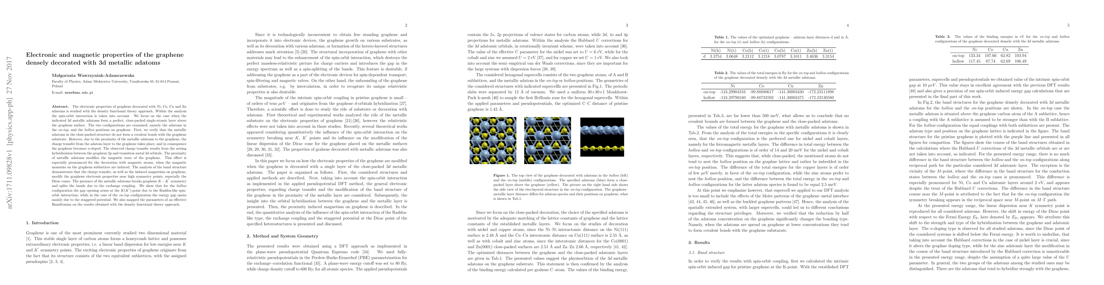 The electronic properties of graphene decorated with Ni, Co, Cu and Zn adatoms is studied with the density functional theory approach. Within the analysis the spin-orbit interaction is taken into account. We focus on the case when the indicated $3d$ metallic adatoms form a perfect, close-packed single-atomic layer above the graphene surface. The two configurations are examined, namely the adatoms in the on-top, and the hollow positions on graphene. First, we verify that the metallic adatoms in the close-packed structure do not form a covalent bonds with the graphene substrate. However, due to the proximity of the metallic adatoms to the graphene, the charge transfer from the adatom layer to the graphene takes place, and in consequence the graphene becomes $n$-doped. The observed charge transfer results from the arising hybridization between the graphene $2p$ and transition metal $3d$ orbitals. The proximity of metallic adatoms modifies the magnetic state of the graphene. This effect is especially pronounced for the decoration with magnetic atoms, when the magnetic moments on the graphene sublattices are induced. The analysis of the band structure demonstrates that the charge transfer, as well as the induced magnetism on graphene, modify the graphene electronic properties near high symmetry points, especially the Dirac cones. The presence of the metallic adatoms breaks graphene $K-K^{'}$ symmetry and splits the bands due to the exchange coupling. We show that for the hollow configuration the gap opening arises at the $K(K^{'})$-point due to the Rashba-like spin-orbit interaction, while in the case of the on-top configuration the energy gap opens mainly due to the staggered potential. We also mapped the parameters of an effective Hamiltonian on the results obtained with the density functional theory approach.