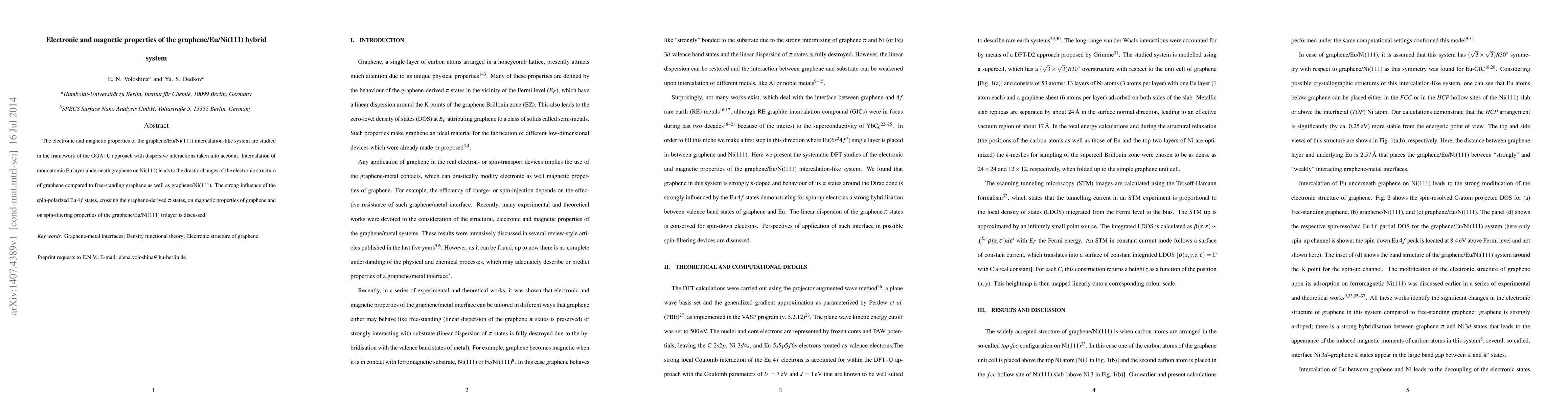 The paper presents detailed DFT calculations of the electronic and magnetic properties of the graphene/Eu/Ni(111) hybrid system, highlighting the role of Eu 4f states in modifying graphene's electronic structure and magnetic properties.