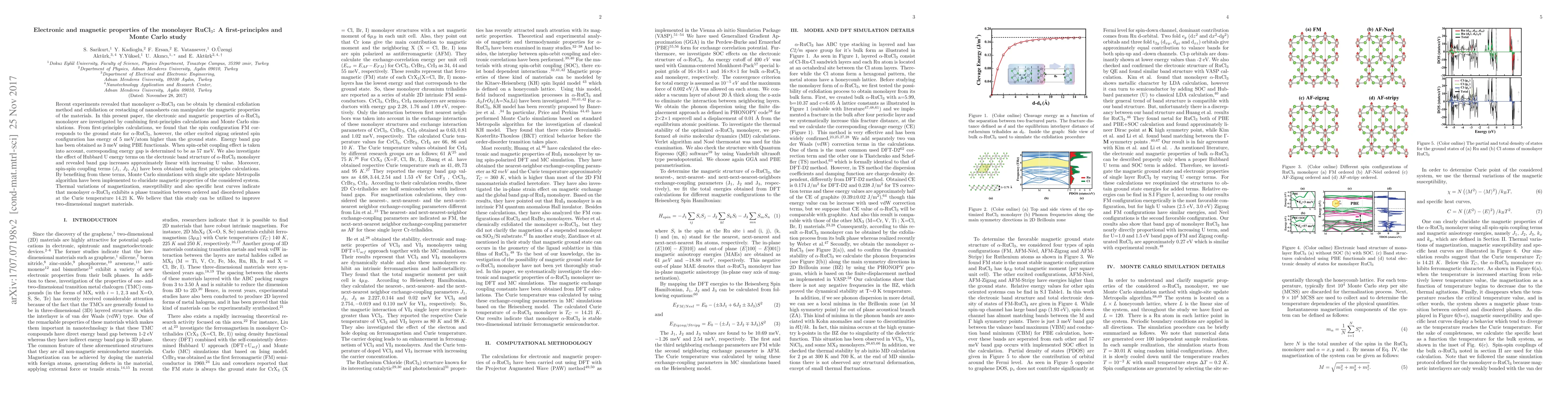 Recent experiments revealed that monolayer $\alpha$-RuCl$_3$ can be obtain by chemical exfoliation method and exfoliation or restacking of nanosheets can manipulate the magnetic properties of the materials. In this present paper, the electronic and magnetic properties of $\alpha$-RuCl$_3$ monolayer are investigated by combining first-principles calculations and Monte Carlo simulations. From first-principles calculations, we found that the spin configuration FM corresponds to the ground state for $\alpha$-RuCl$_3$, however, the other excited zigzag oriented spin configuration has energy of 5 meV/atom higher than the ground state. Energy band gap has been obtained as $3$ meV using PBE functionals. When spin-orbit coupling effect is taken into account, corresponding energy gap is determined to be as $57$ meV. We also investigate the effect of Hubbard U energy terms on the electronic band structure of $\alpha$-RuCl$_3$ monolayer and revealed band gap increases approximately linear with increasing U value. Moreover, spin-spin coupling terms ($J_1$, $J_2$, $J_3$) have been obtained using first principles calculations. By benefiting from these terms, Monte Carlo simulations with single site update Metropolis algorithm have been implemented to elucidate magnetic properties of the considered system. Thermal variations of magnetization, susceptibility and also specific heat curves indicate that monolayer $\alpha$-RuCl$_3$ exhibits a phase transition between ordered and disordered phases at the Curie temperature $14.21$ K. We believe that this study can be utilized to improve two-dimensional magnet materials.
