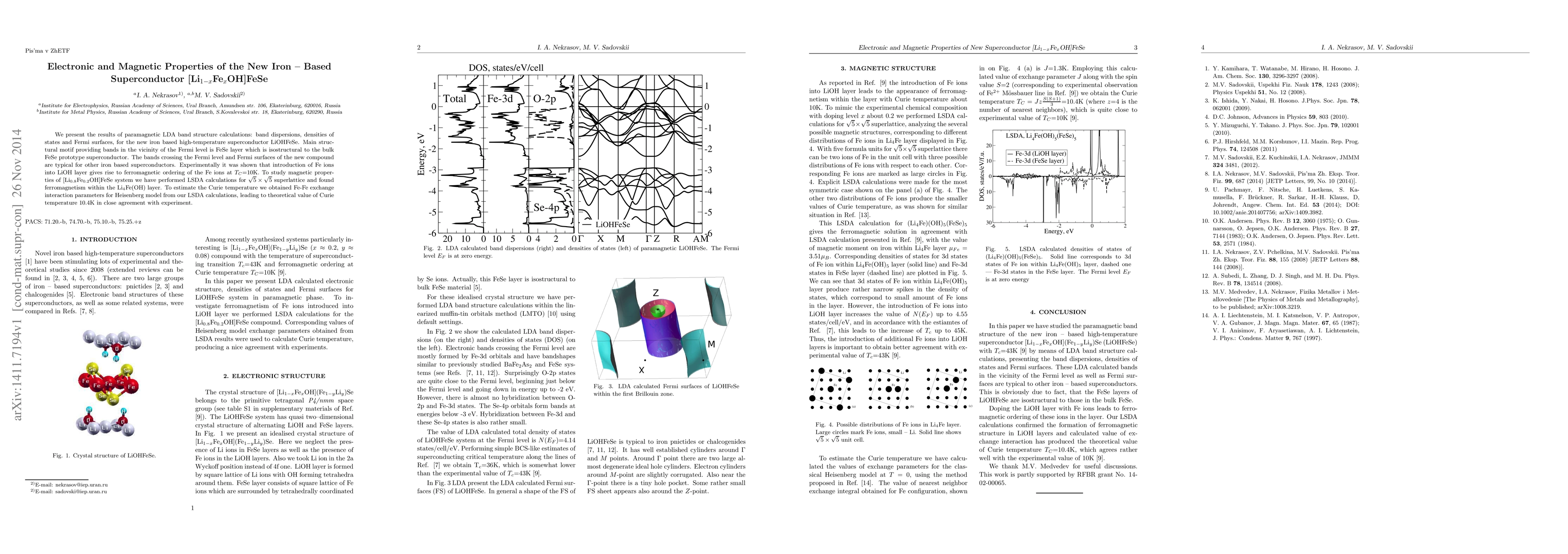 We present the results of paramagnetic LDA band structure calculations: band dispersions, densities of states and Fermi surfaces, for the new iron based high-temperature superconductor LiOHFeSe. Main structural motif providing bands in the vicinity of the Fermi level is FeSe layer which is isostructural to the bulk FeSe prototype superconductor. The bands crossing the Fermi level and Fermi surfaces of the new compound are typical for other iron based superconductors. Experimentally it was shown that introduction of Fe ions into LiOH layer gives rise to ferromagnetic ordering of the Fe ions at T$_C$=10K. To study magnetic properties of [Li$_{0.8}$Fe$_{0.2}$OH]FeSe system we have performed LSDA calculations for $\sqrt 5 \times \sqrt 5$ superlattice and found ferromagnetism within the Li$_4$Fe(OH) layer. To estimate the Curie temperature we obtained Fe-Fe exchange interaction parameters for Heisenberg model from our LSDA calculations, leading to theoretical value of Curie temperature 10.4K in close agreement with experiment.