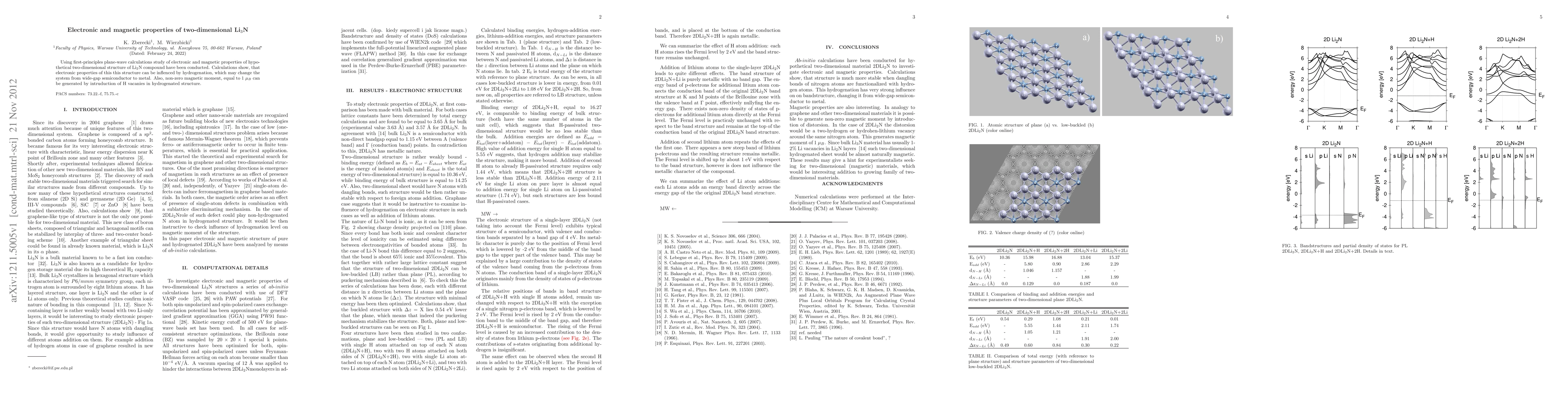 Using first-principles plane-wave calculations study of electronic and magnetic properties of hypothetical two-dimensional structure of Li$_{2}$N compound have been conducted. Calculations show, that electronic properties of this this structure can be inflenced by hydrogenation, which may change the system from wide-gap semiconductor to metal. Also, non-zero magnetic moment, equal to 1 $\mu_{B}$ can be generated by intruduction of H vacanies in hydrogenated structure.