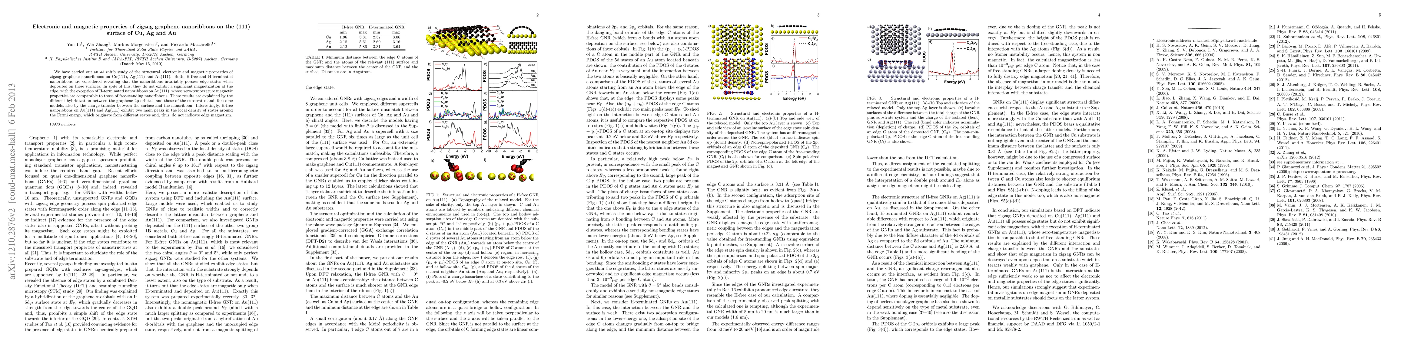 This study investigates zigzag graphene nanoribbons on Cu(111), Ag(111), and Au(111) using ab initio methods, revealing edge states without significant magnetization except for H-terminated nanoribbons on Au(111). H-free nanoribbons on Au(111) and Ag(111) show two peaks in the local density of states due to different states, not indicating edge magnetism.