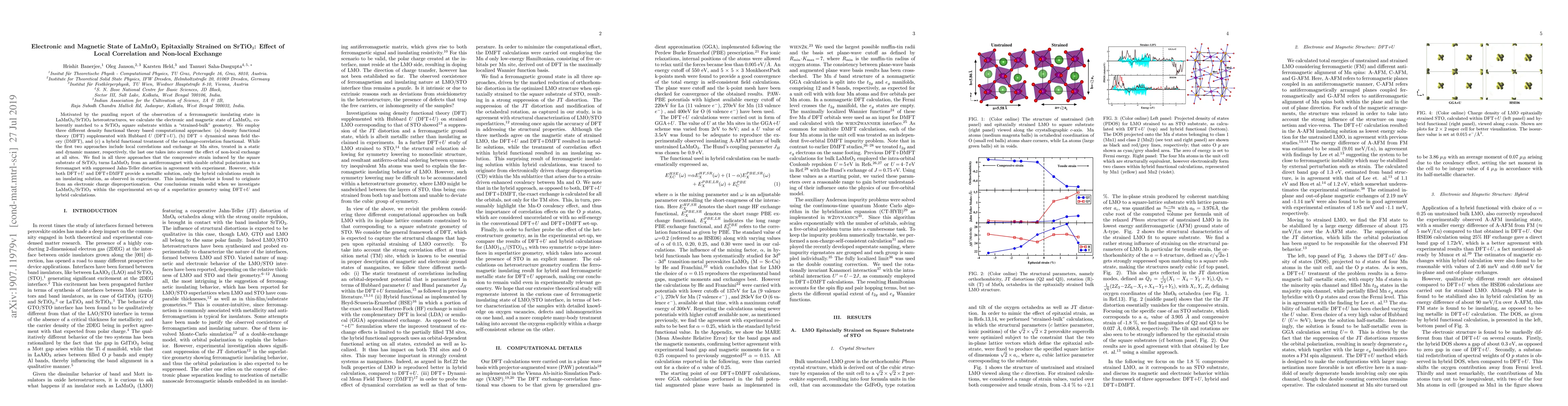 This research investigates the electronic and magnetic properties of epitaxially strained LaMnO$_3$ on SrTiO$_3$ using three density functional theory approaches. It finds that compressive strain transforms LaMnO$_3$ from an antiferromagnetic to a ferromagnetic state, with hybrid functional calculations correctly predicting the observed insulating behavior due to electronic charge disproportionation.