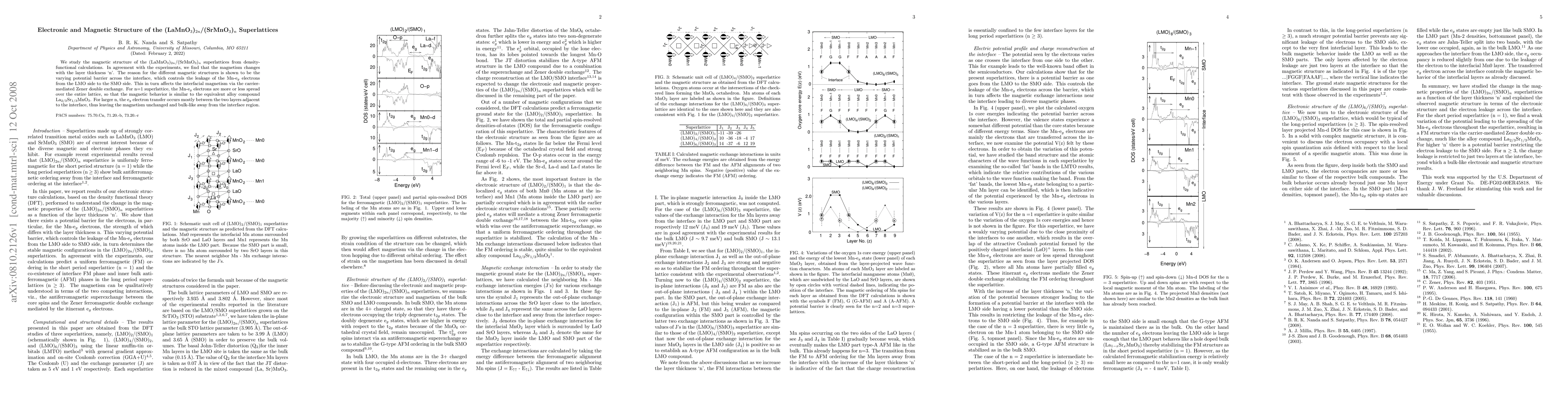This study investigates the electronic and magnetic structure of (LaMnO$_3$)$_{2n}$/(SrMnO$_3$)$_n$ superlattices using density-functional calculations, revealing that magnetism varies with layer thickness `n' due to differing potential barriers across the interface, which influences the leakage of Mn-e$_g$ electrons and affects interfacial magnetism via carrier-mediated Zener double exchange.