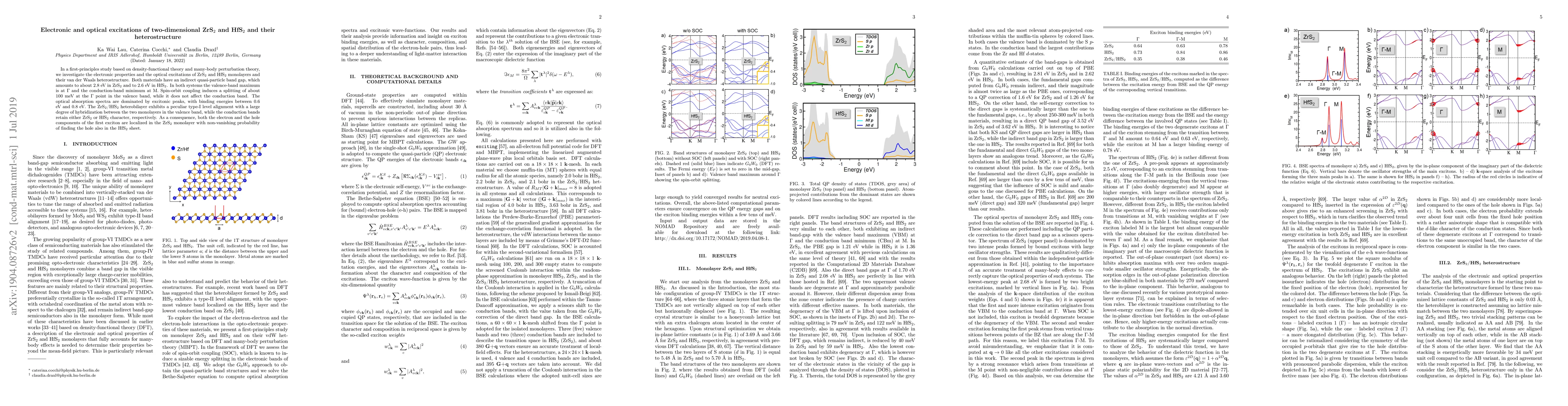 In a first-principles study based on density-functional theory and many-body perturbation theory we investigate the electronic properties and the optical excitations of ZrS$_2$ and HfS$_2$ monolayers and their van der Waals heterostructure. Both materials have an indirect quasi-particle band gap, which amounts to about 2.8 eV in ZrS$_2$ and to 2.6 eV in HfS$_2$. In both systems the valence-band maximum is at $\Gamma$ and the conduction-band minimum at M. Spin-orbit coupling induces a splitting of about 100 meV at the $\Gamma$ point in the valence band, while it does not affect the conduction band. The optical absorption spectra are dominated by excitonic peaks, with binding energies between 0.6 eV and 0.8 eV. The ZrS$_2$/HfS$_2$ heterobilayer exhibits a peculiar type-I level alignment with a large degree of hybridization between the two monolayers in the valence band, while the conduction bands retain either ZrS$_2$ or HfS$_2$ character, respectively. As a consequence, both the electron and the hole components of the first exciton are localized in the ZrS$_2$ monolayer with non-vanishing probability of finding the hole also in the HfS$_2$ sheet.