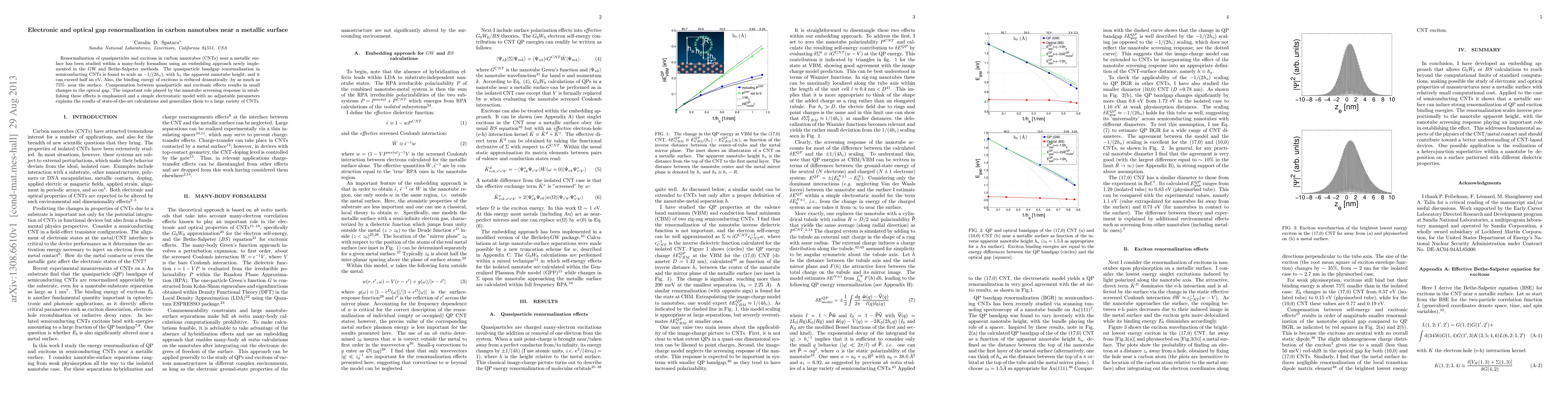Renormalization of quasiparticles and excitons in carbon nanotubes (CNTs) near a metallic surface has been studied within a many-body formalism using an embedding approach newly implemented in the GW and Bethe-Salpeter methods. The quasiparticle bandgap renormalization in semiconducting CNTs is found to scale as -1/(2h_a), with h_a the apparent nanotube height, and it can exceed half an eV. Also, the binding energy of excitons is reduced dramatically -by as much as 75%- near the surface. Compensation between quasiparticle and excitonic effects results in small changes in the optical gap. The important role played by the nanotube screening response in establishing these effects is emphasized and a simple electrostatic model with no adjustable parameters explains the results of state-of-the-art calculations and generalizes them to a large variety of CNTs.
