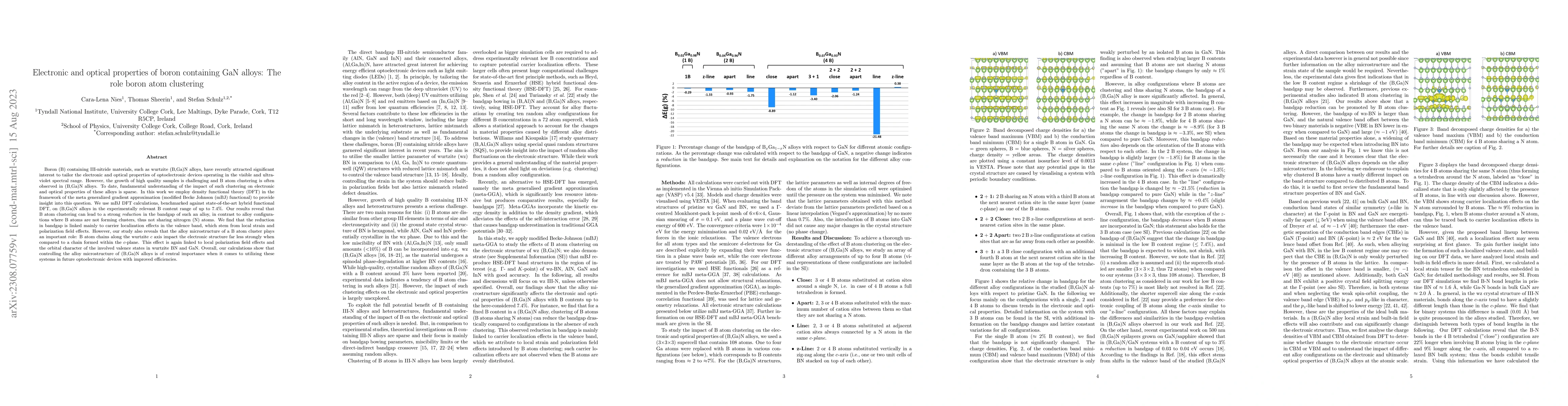 This study uses density functional theory to investigate the impact of boron atom clustering in (B,Ga)N alloys on their electronic and optical properties. The findings show that B clustering significantly reduces the bandgap due to carrier localization effects, with B chains along the wurtzite c-axis having a lesser impact compared to in-plane chains, highlighting the importance of alloy microstructure in optoelectronic applications.