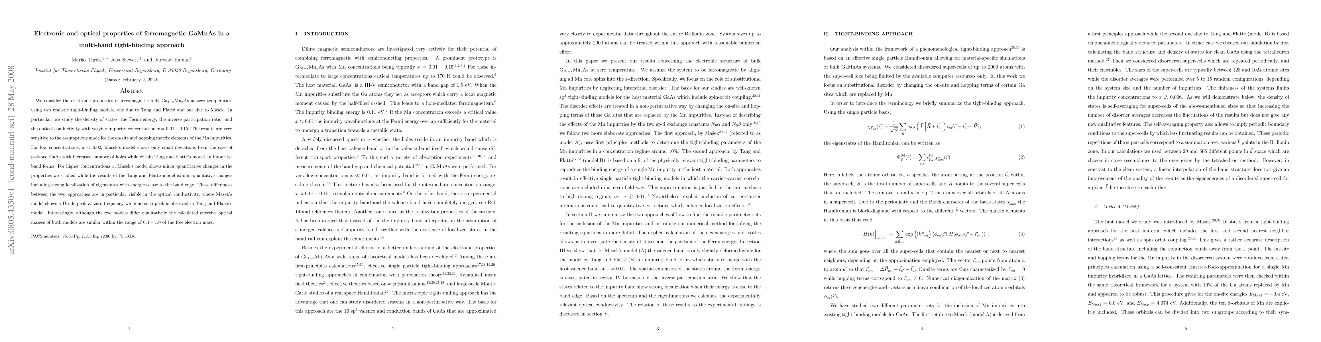 This paper investigates the electronic and optical properties of ferromagnetic GaMnAs using two tight-binding models, revealing that the results depend heavily on the assumptions regarding Mn impurity interactions. While Masek's model shows minor changes, Tang and Flatte's model exhibits significant differences, especially at higher impurity concentrations, including the formation of an impurity band and strong localization effects.