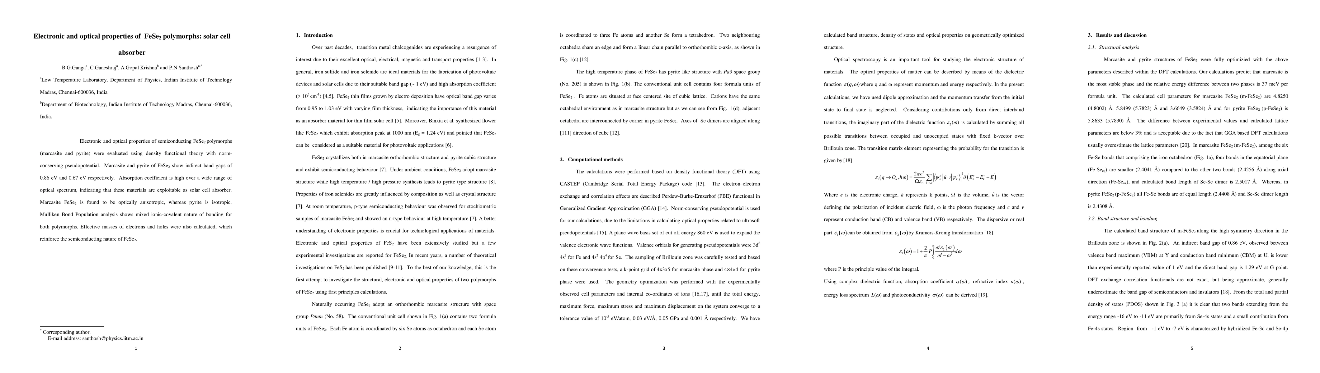 Research finds FeSe2 polymorphs (marcasite and pyrite) have suitable electronic and optical properties for use as solar cell absorbers, with high absorption coefficients over a wide range of optical spectra.