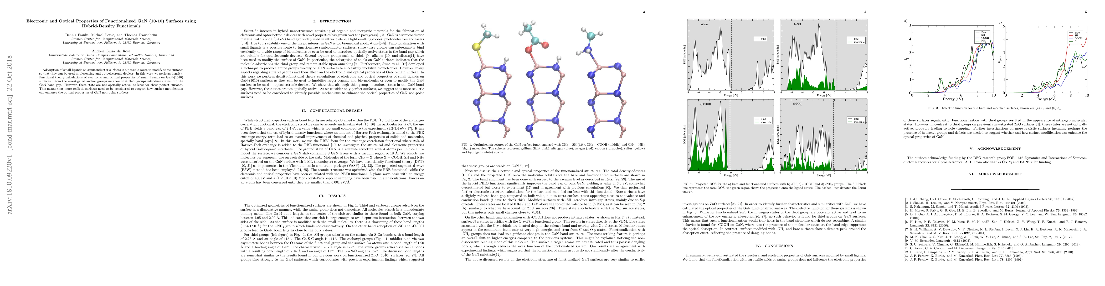 Adsorption of small ligands on semiconductor surfaces is a possible route to modify these surfaces so that they can be used in biosensing and optoelectronic devices. In this work we perform density-functional theory calculations of electronic and optical properties of small ligands on GaN-(10$\bar1$0) surfaces. From the investigated anchor groups we show that thiol groups introduce states into the GaN band gap. However, these state are not optically active, at least for these perfect surfaces. This means that more realistic surfaces need to be considered to suggest how surface modification can enhance the optical properties of GaN non-polar surfaces.