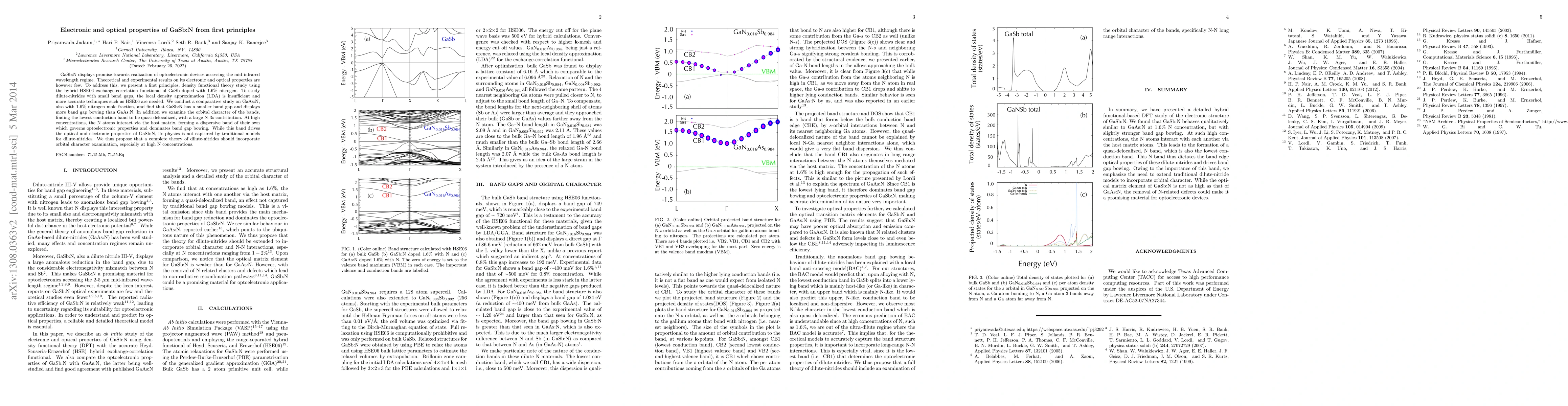 GaSb:N displays promise towards realization of optoelectronic devices accessing the mid-infrared wavelength regime. Theoretical and experimental results on its electronic and optical properties are however few. To address this, we present a first principles, density functional theory study using the hybrid HSE06 exchange-correlation functional of GaSb doped with 1.6$\%$ nitrogen. To study dilute-nitrides with small band gaps, the local density approximation (LDA) is insufficient and more accurate techniques such as HSE06 are needed. We conduct a comparative study on GaAs:N, also with 1.6$\%$ nitrogen mole fraction, and find that GaSb:N has a smaller band gap and displays more band gap bowing than GaAs:N. In addition we examine the orbital character of the bands, finding the lowest conduction band to be quasi-delocalized, with a large N-$3s$ contribution. At high concentrations, the N atoms interact via the host matrix, forming a dispersive band of their own which governs optoelectronic properties and dominates band gap bowing. While this band drives the optical and electronic properties of GaSb:N, its physics is not captured by traditional models for dilute-nitrides. We thus propose that a complete theory of dilute-nitrides should incorporate orbital character examination, especially at high N concentrations.