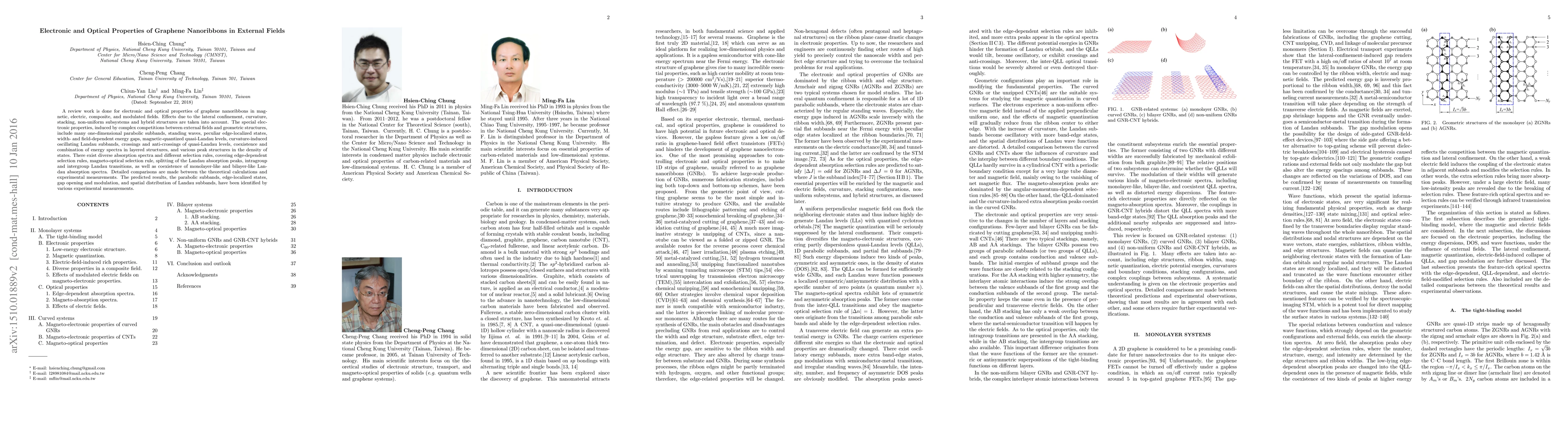 This paper reviews the electronic and optical properties of graphene nanoribbons under various external fields, highlighting the effects of confinement, curvature, and hybrid structures. It discusses complex phenomena such as one-dimensional parabolic subbands, edge-localized states, and diverse absorption spectra, and compares theoretical predictions with experimental results.