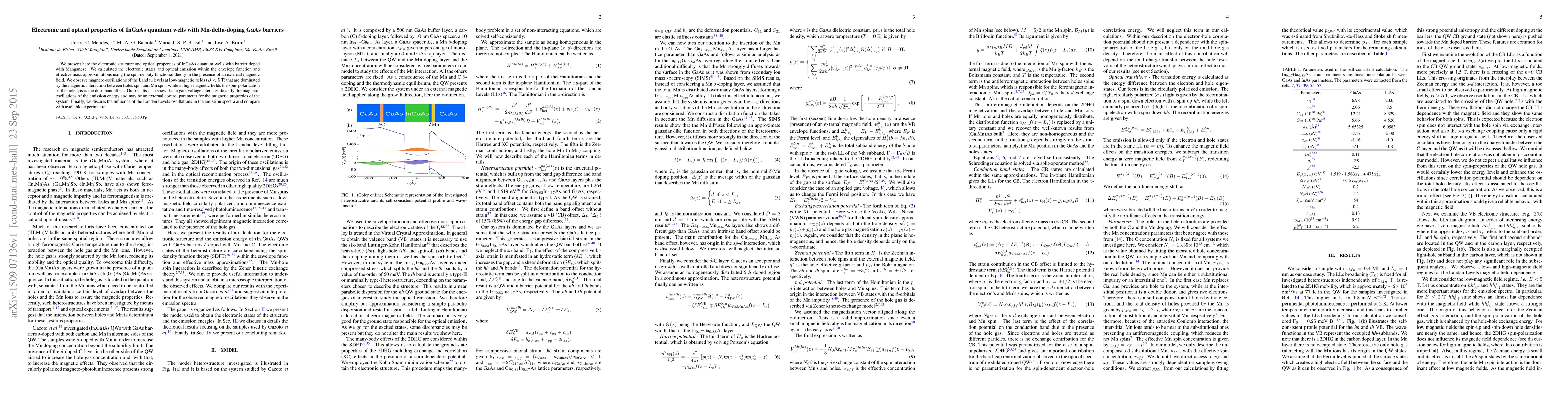 We present here the electronic structure and optical properties of InGaAs quantum wells with barrier doped with Manganese. We calculated the electronic states and optical emission within the envelope function and effective mass approximations using the spin-density functional theory in the presence of an external magnetic field. We observe magneto-oscillations of the Landau levels at low-magnetic fields (B < 5 T) that are dominated by the magnetic interaction between holes spin and Mn spin, while at high magnetic fields the spin-polarization of the hole gas is the dominant effect. Our results also show that a gate voltage alter significantly the magneto-oscillations of the emission energy and may be an external control parameter for the magnetic properties of the system. Finally, we discuss the influence of the Landau Levels oscillations in the emission spectra and compare with available experimental.