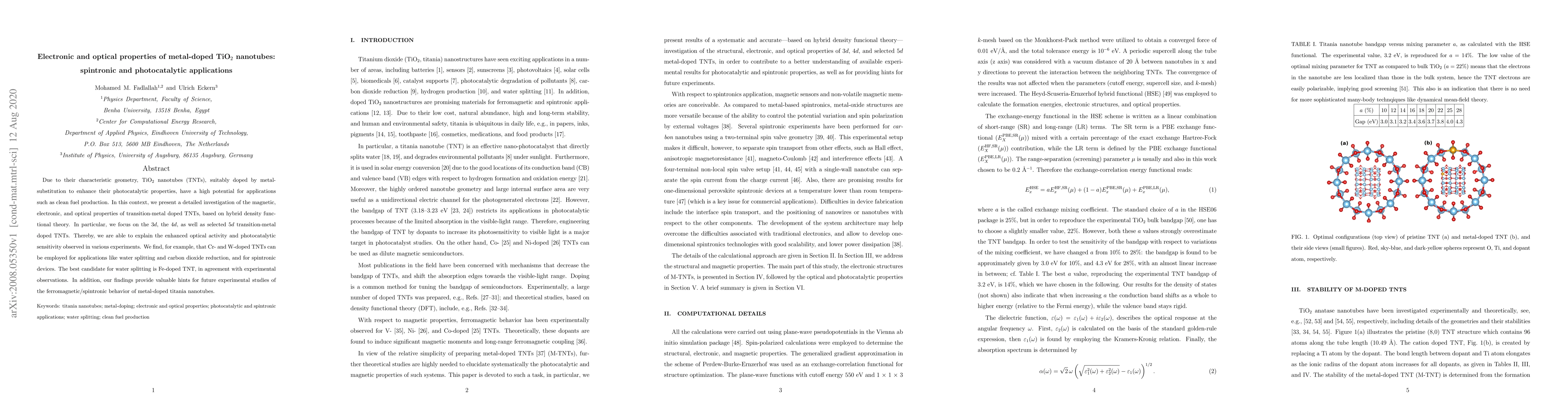 Due to their characteristic geometry, TiO$_2$ nanotubes (TNTs), suitably doped by metal-substitution to enhance their photocatalytic properties, have a high potential for applications such as clean fuel production. In this context, we present a detailed investigation of the magnetic, electronic, and optical properties of transition-metal doped TNTs, based on hybrid density functional theory. In particular, we focus on the $3d$, the $4d$, as well as selected $5d$ transition-metal doped TNTs. Thereby, we are able to explain the enhanced optical activity and photocatalytic sensitivity observed in various experiments. We find, for example, that Cr- and W-doped TNTs can be employed for applications like water splitting and carbon dioxide reduction, and for spintronic devices. The best candidate for water splitting is Fe-doped TNT, in agreement with experimental observations. In addition, our findings provide valuable hints for future experimental studies of the ferromagnetic/spintronic behavior of metal-doped titania nanotubes.