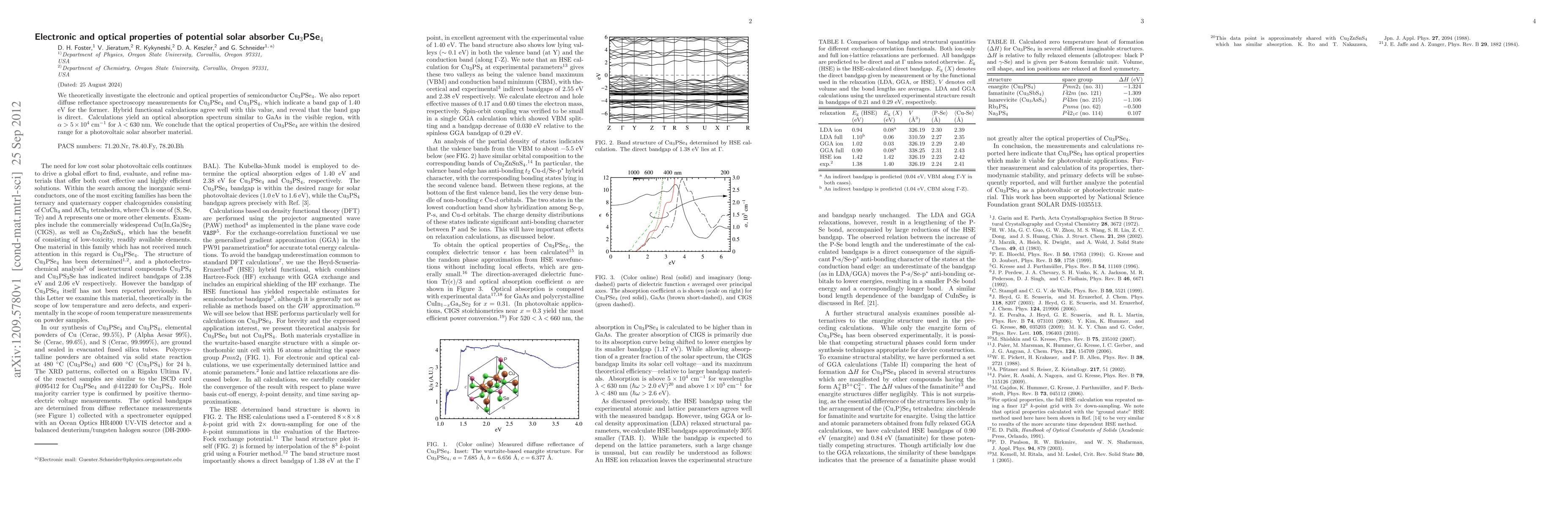 Theoretical study shows Cu3PSe4 has a direct band gap of 1.40 eV, suitable for solar absorber material, with optical properties similar to GaAs in the visible region.