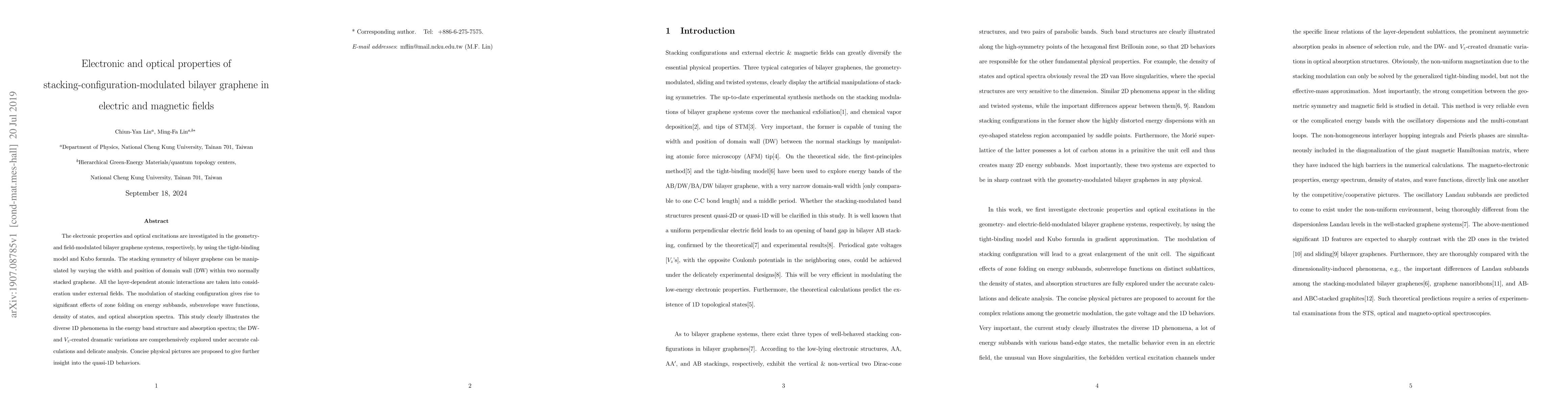 The electronic properties and optical excitations are investigated in the geometry- and field-modulated bilayer graphene systems, respectively, by using the tight-binding model and Kubo formula. The stacking symmetry of bilayer graphene can be manipulated by varying the width and position of domain wall (DW) within two normally stacked graphene. All the layer-dependent atomic interactions are taken into consideration under external fields. The modulation of stacking configuration gives rise to significant effects of zone folding on energy subbands, subenvelope wave functions, density of states, and optical absorption spectra. This study clearly illustrates the diverse 1D phenomena in the energy band structure and absorption spectra; the DW- and $V_z$-created dramatic variations are comprehensively explored under accurate calculations and delicate analysis. Concise physical pictures are proposed to give further insight into the quasi-1D behaviors.