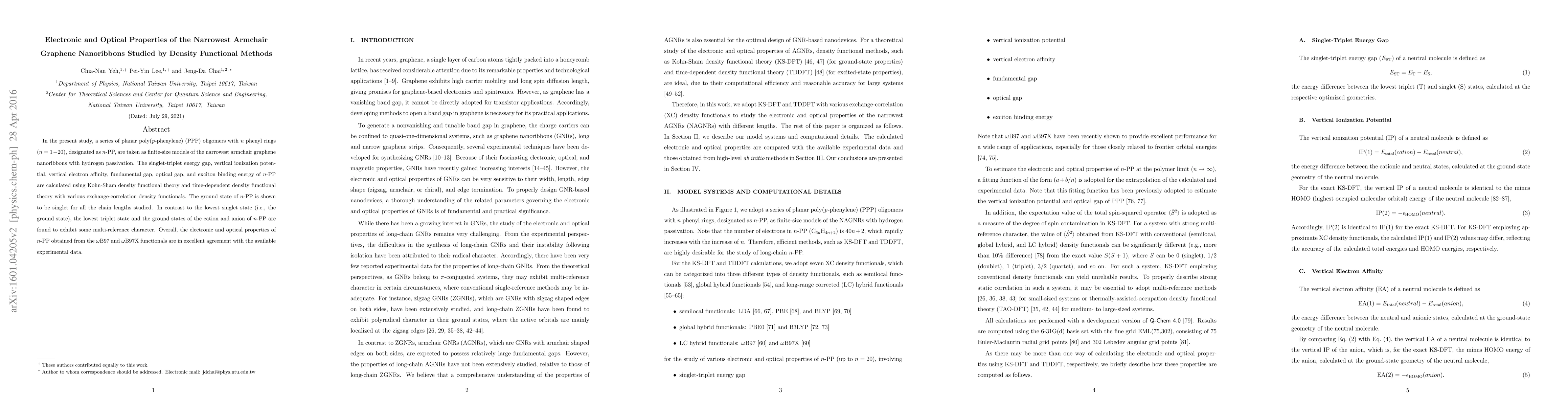 In the present study, a series of planar poly(p-phenylene) (PPP) oligomers with n phenyl rings (n = 1 - 20), designated as n-PP, are taken as finite-size models of the narrowest armchair graphene nanoribbons with hydrogen passivation. The singlet-triplet energy gap, vertical ionization potential, vertical electron affinity, fundamental gap, optical gap, and exciton binding energy of n-PP are calculated using Kohn-Sham density functional theory and time-dependent density functional theory with various exchange-correlation density functionals. The ground state of n-PP is shown to be singlet for all the chain lengths studied. In contrast to the lowest singlet state (i.e., the ground state), the lowest triplet state and the ground states of the cation and anion of n-PP are found to exhibit some multi-reference character. Overall, the electronic and optical properties of n-PP obtained from the omegaB97 and omegaB97X functionals are in excellent agreement with the available experimental data.