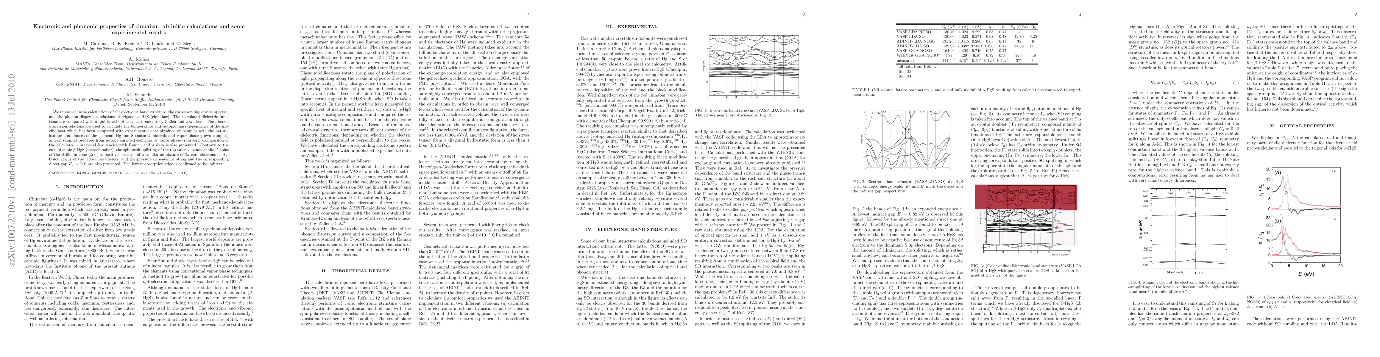 This paper reports ab initio calculations on the electronic and phononic properties of cinnabar (alpha-HgS), including band structure, optical spectra, and phonon dispersion. Comparisons with experimental data confirm the positive spin-orbit splitting and the indirect nature of the lowest absorption edge.