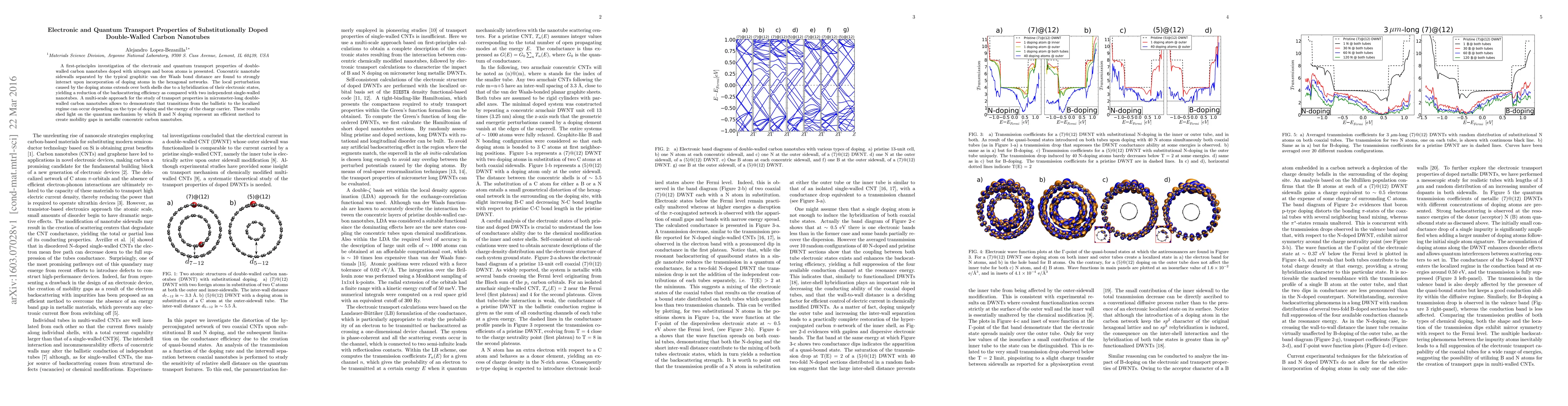 This study investigates how nitrogen and boron doping affects the electronic and quantum transport properties of double-walled carbon nanotubes using first-principles methods. The doping atoms cause strong interaction and hybridization between the tubes, reducing backscattering and altering transport regimes based on the type of dopant and charge carrier energy.