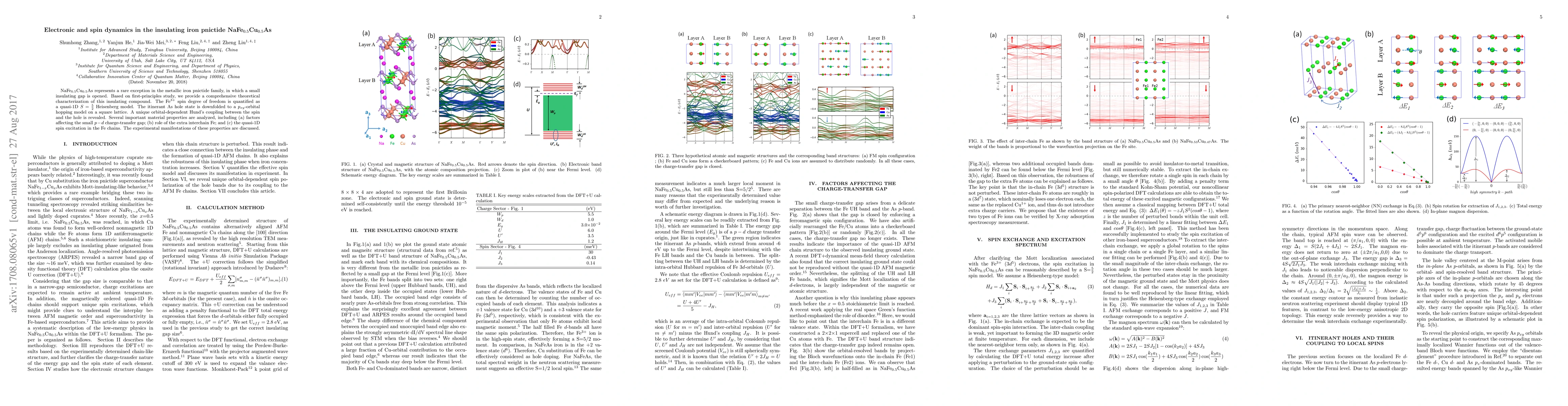 NaFe$_{0.5}$Cu$_{0.5}$As represents a rare exception in the metallic iron pnictide family, in which a small insulating gap is opened. Based on first-principles study, we provide a comprehensive theoretical characterization of this insulating compound. The Fe$^{3+} $spin degree of freedom is quantified as a quasi-1D $S=\frac{5}{2}$ Heisenberg model. The itinerant As hole state is downfolded to a $p_{xy}$-orbital hopping model on a square lattice. A unique orbital-dependent Hund's coupling between the spin and the hole is revealed. Several important material properties are analyzed, including (a) factors affecting the small $p-d$ charge-transfer gap; (b) role of the extra interchain Fe; and (c) the quasi-1D spin excitation in the Fe chains. The experimental manifestations of these properties are discussed.