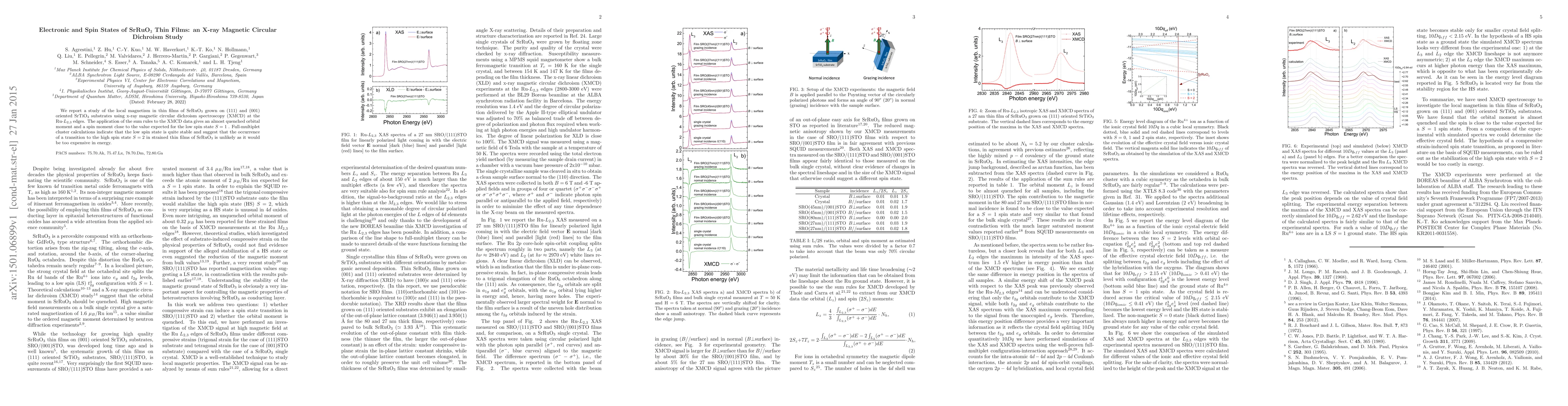 We report a study of the local magnetism in thin films of SrRuO3 grown on (111) and (001) oriented SrTiO3 substrates using x-ray magnetic circular dichroism spectroscopy (XMCD) at the Ru-L2,3 edges. The application of the sum rules to the XMCD data gives an almost quenched orbital moment and a spin moment close to the value expected for the low spin state S = 1 . Full-multiplet cluster calculations indicate that the low spin state is quite stable and suggest that the occurrence of a transition to the high spin state S = 2 in strained thin films of SrRuO3 is unlikely as it would be too expensive in energy.