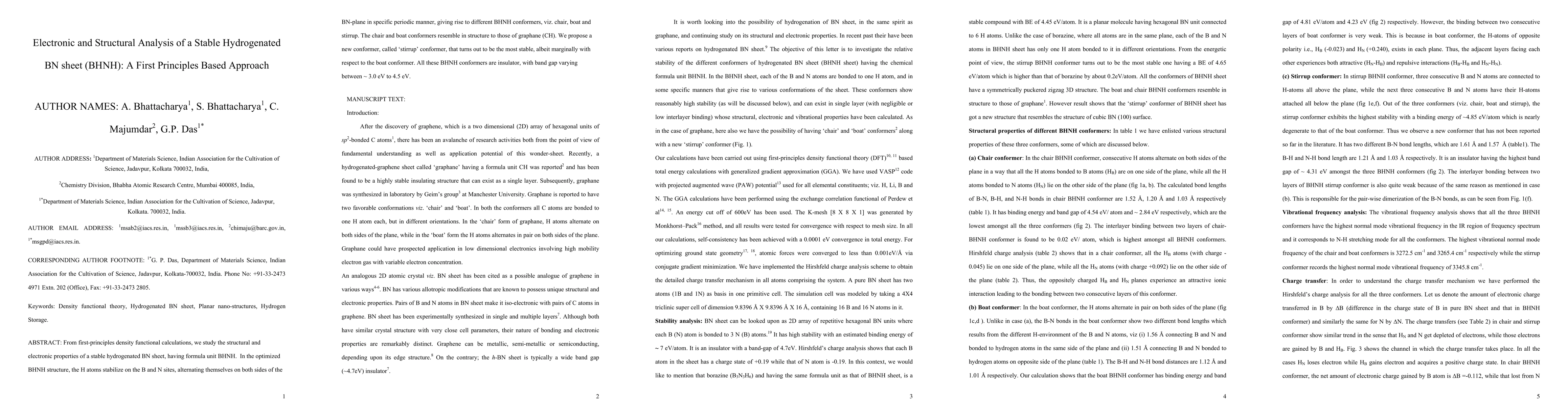 This paper investigates the structural and electronic properties of hydrogenated BN sheets (BHNH) using first-principles density functional calculations. The study reveals that the most stable conformer, 'stirrup,' exhibits insulating behavior with a band gap ranging from ~3.0 eV to 4.5 eV, similar to graphane.