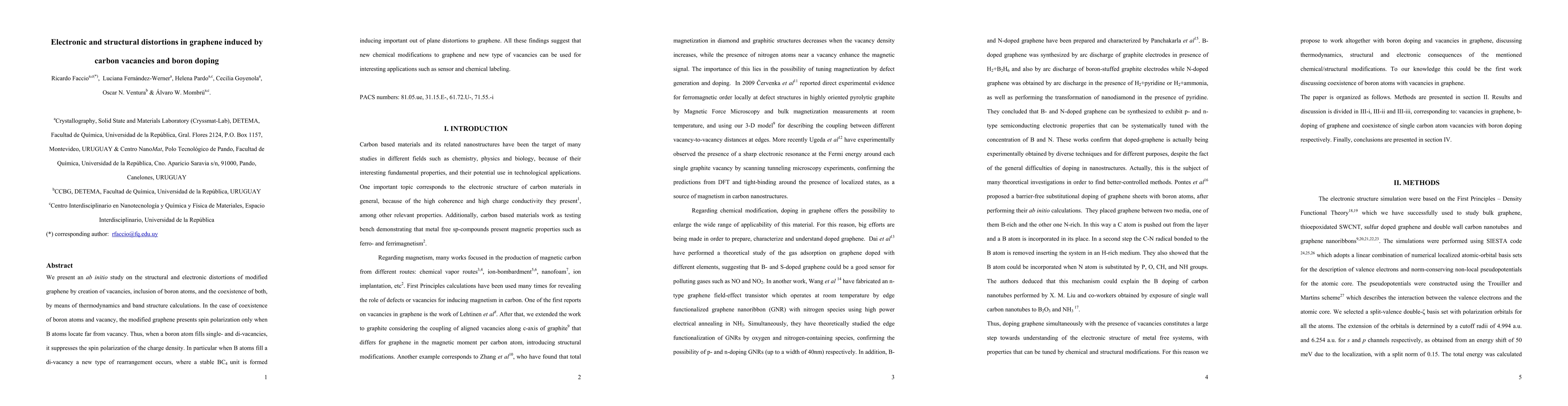 We present an ab initio study on the structural and electronic distortions of modified graphene by creation of vacancies, inclusion of boron atoms, and the coexistence of both, by means of thermodynamics and band structure calculations. In the case of coexistence of boron atoms and vacancy, the modified graphene presents spin polarization only when B atoms locate far from vacancy. Thus, when a boron atom fills single- and di-vacancies, it suppresses the spin polarization of the charge density. In particular when B atoms fill a di-vacancy a new type of rearrangement occurs, where a stable BC4 unit is formed inducing important out of plane distortions to graphene. All these findings suggest that new chemical modifications to graphene and new type of vacancies can be used for interesting applications such as sensor and chemical labeling.